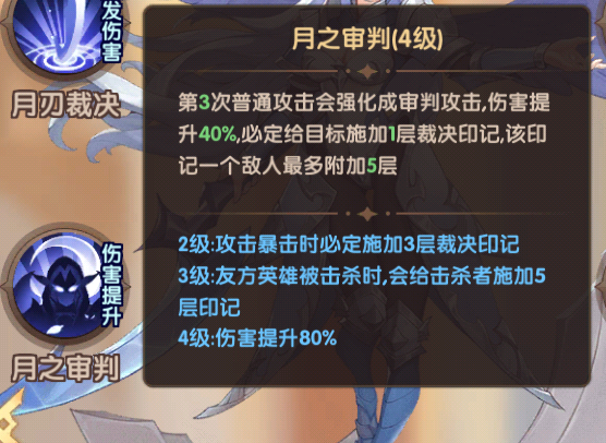 月之审判:第3次攻击会强化成审判攻击,伤害提升80%并给目标附带一层印记。如果友方英雄被击杀时,会给凶手施加5层印记。