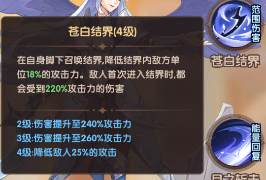 苍白结界:召唤结界降低结界内敌方25%的攻击,对进入结界的敌人造成260%的伤害。