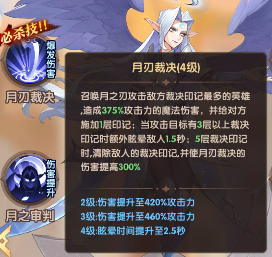必杀技月刃裁决:攻击裁决印记最多的敌方单位并附加一层印记,敌方叠加印记至3层时附加眩晕效果2.5秒。叠满5层印记时清空敌人所有印记,并使月刃裁决伤害提升至460%。