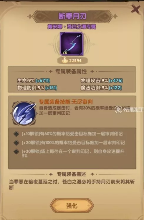 专属武器断罪月刃:造成暴击时100%给目标施加一层审判印记,场上没存在一个印记攻速提升5%