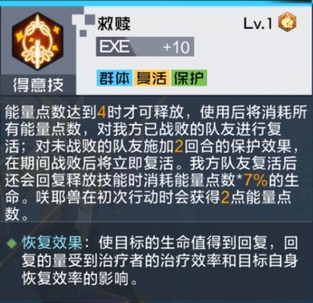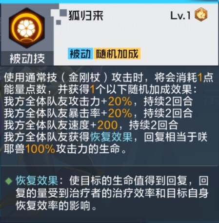 被动技解析:在拥有能量点数的时候进行普通攻击可以为全队进行增益或者生命值回复,一共有4种效果,分别是攻击力、暴击率、速度、恢复效果。