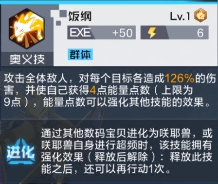 奥义技解析:高伤害AOE技能,可以使自己获得4点能量点数,超频以后还可以再行动一次。如果放在五号位行动,第一回合超频即可使用得意技,为全队施加复活效果。
