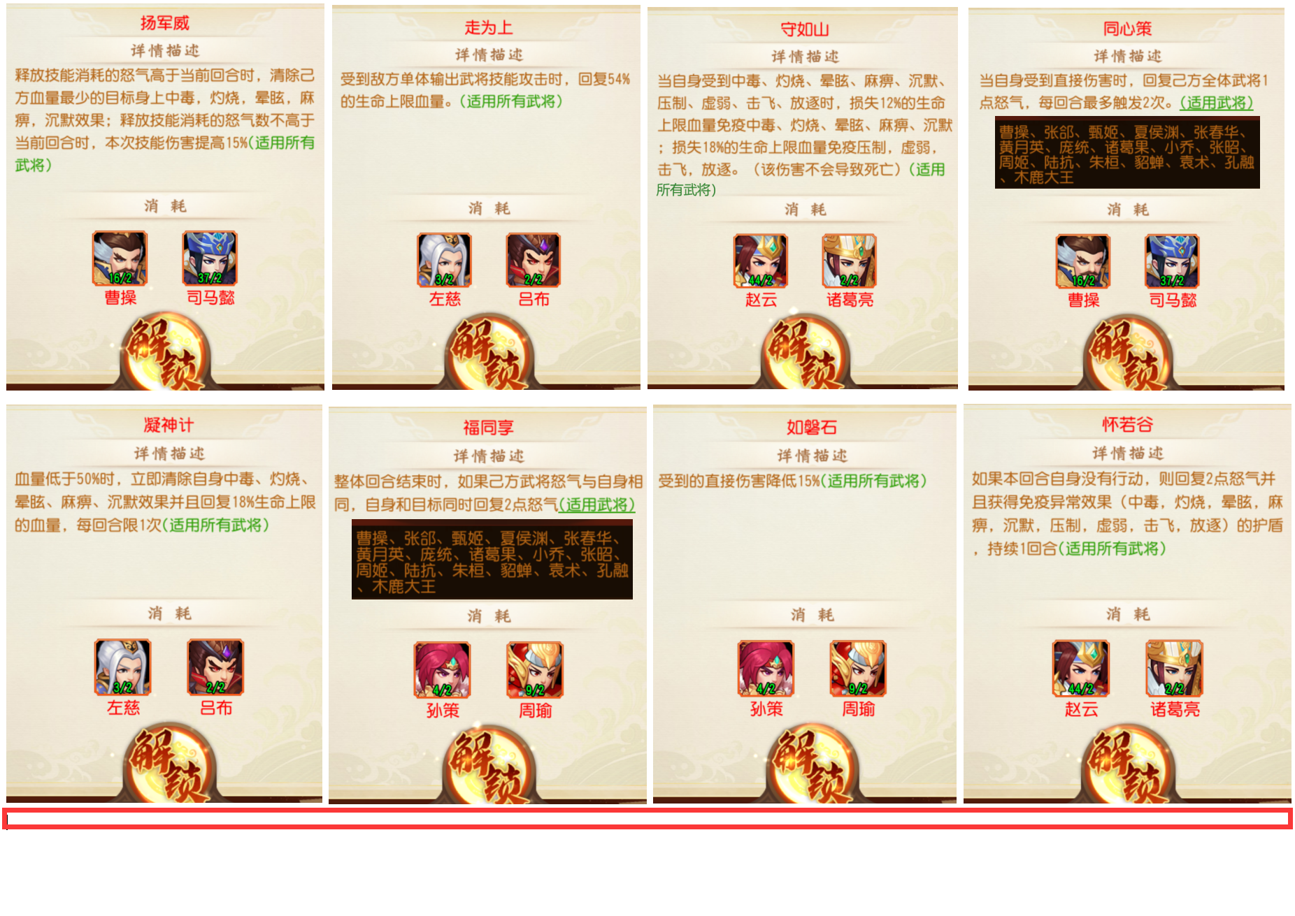 8个红色战法里面,除去“福同享”之外,剩下的7个都是十分值得入手的选择,后续战法位解锁多了以后,也不担心用不上的情况,而且综合性价比而已,这七个红战法会是大部分玩家使用频率最高的;其中“扬军威”和“凝神计”都是针对解除毒火去使用的,能够稳定且持续性的进行解除,并且是全部武将适用的,搭配橙战法灵魄,任何阵容都具备强大抗火毒性了,故也不再赘述这部分的影响!