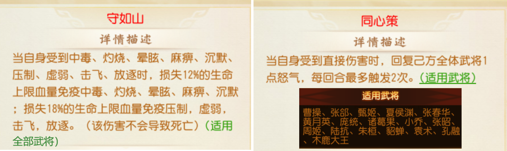 气定神闲同样是收益十分高的战法,跟守如山具有一样的作用,最大意义都是去让白泽失效,并且没有副作用,还能同时免疫白虎的减怒压制,更适合主力爆发输出去用;而用守如山搭配给阵容中的高抗性女将去防击飞,可以持续的现在对手子上的输出!