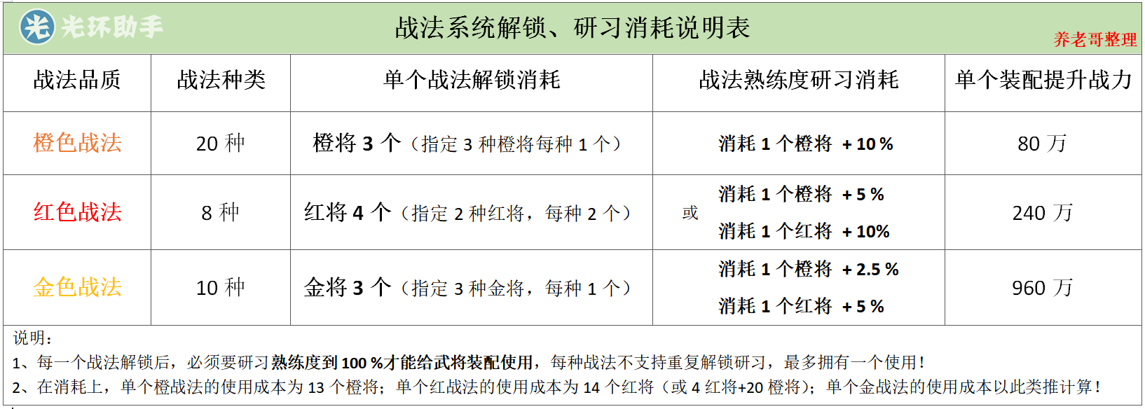 另一方面,金色战法的可以说是解决了近两个月以来,大部分玩家激活名将册后闲置下的金将用不上的苦恼。每一个金战法去解锁都要用到一个国家的所有金将各1个,对于开完名将册后的情况是再合适不过了,零零散散的金将没法置换到一起去使用,但是用来解锁战法又能给阵容带来新的提升,可以说是一举两得吧!