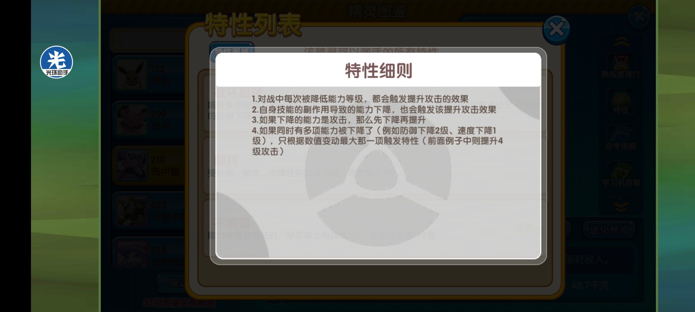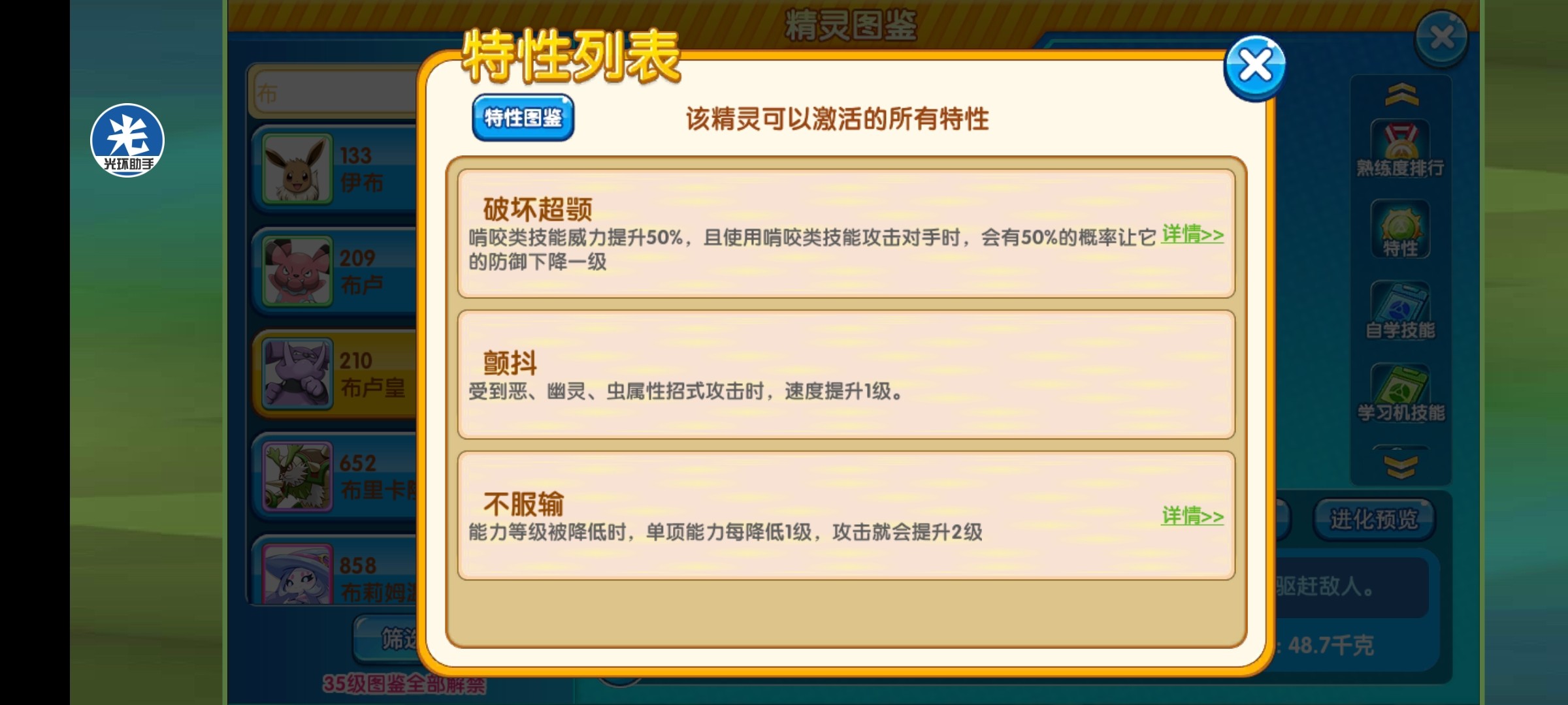 技能方面强化技能只有健美,不过不太推荐,强化太慢,输出技能里面就是三牙最好,不过这里注意,愤怒之牙虽然按照图鉴描述,也享受特性加成,但是经过实验,它的伤害只能是对方半血,加成无法超过技能的特效。