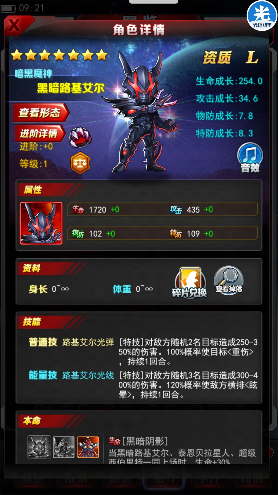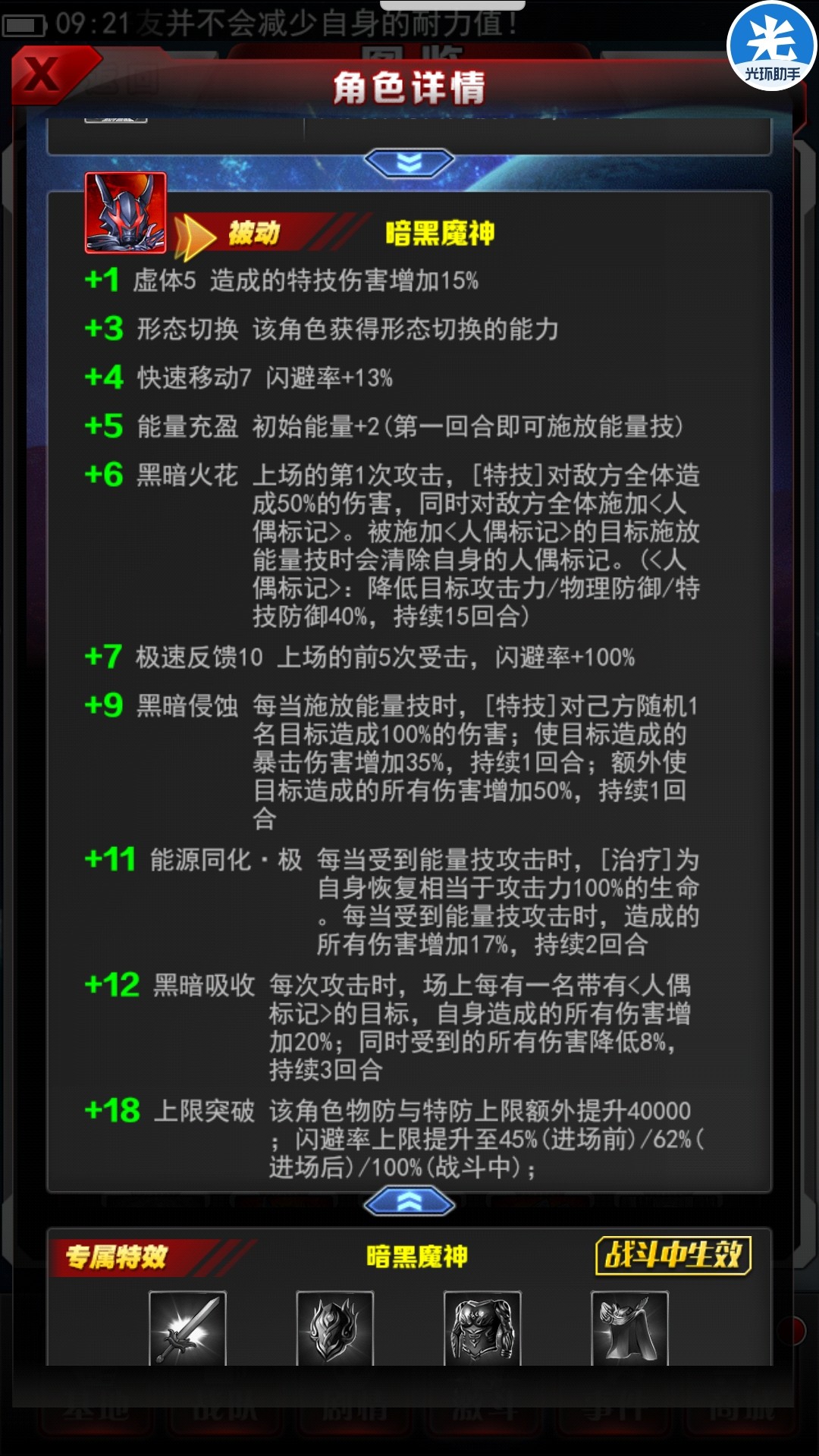 +9被动黑暗侵蚀每当施放能量技时,[特技] 对己方随机1名目标造成100%的伤害;使目标造成的暴击伤害增加35%,持续1回合; 额外使目标造成的所有伤害增加50%,持续1回合,我感觉这个被动好骚,跟他们砍价一样,果然还是搭配个黑暗迪迦更好,还有给对面加成的。