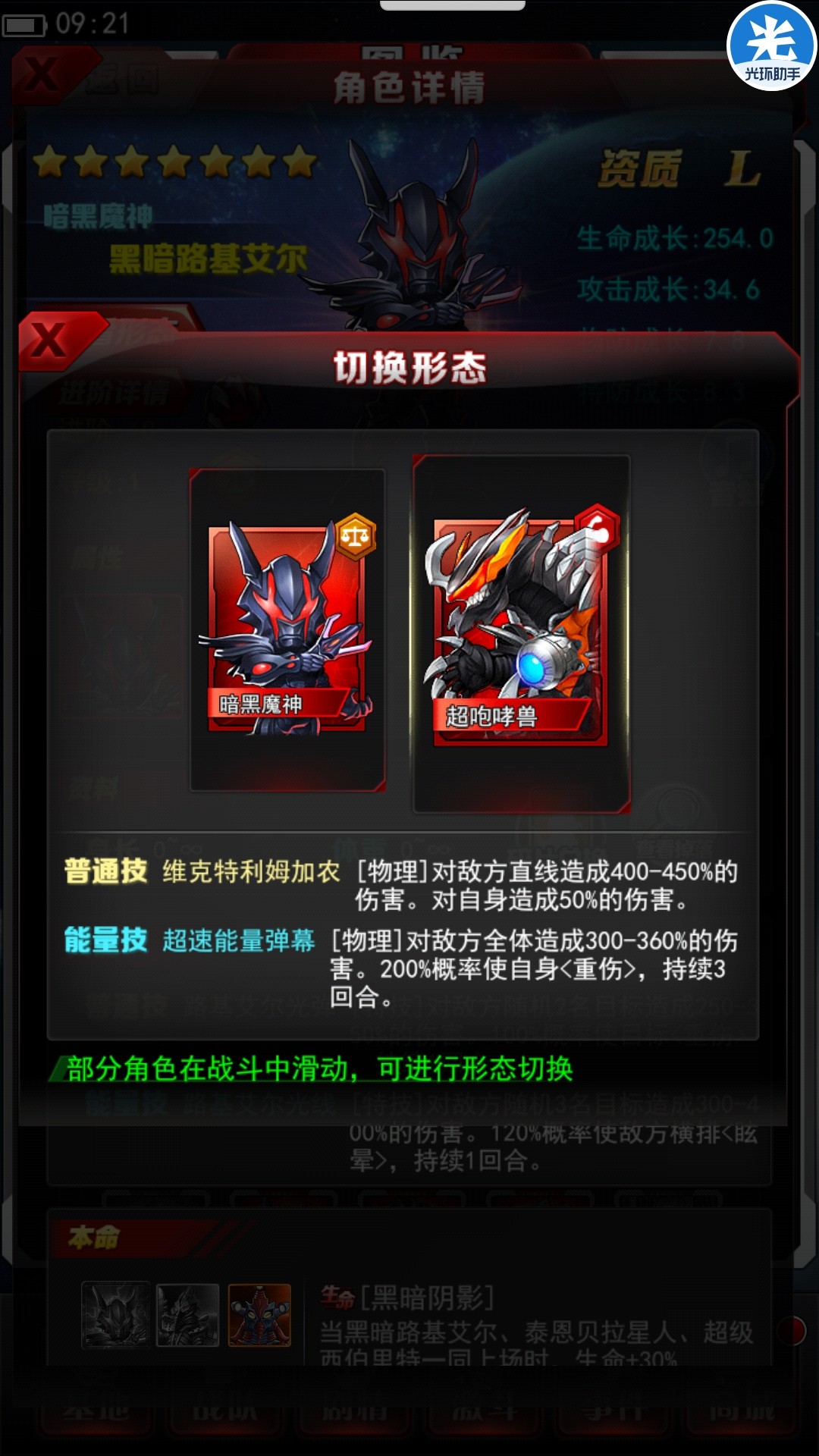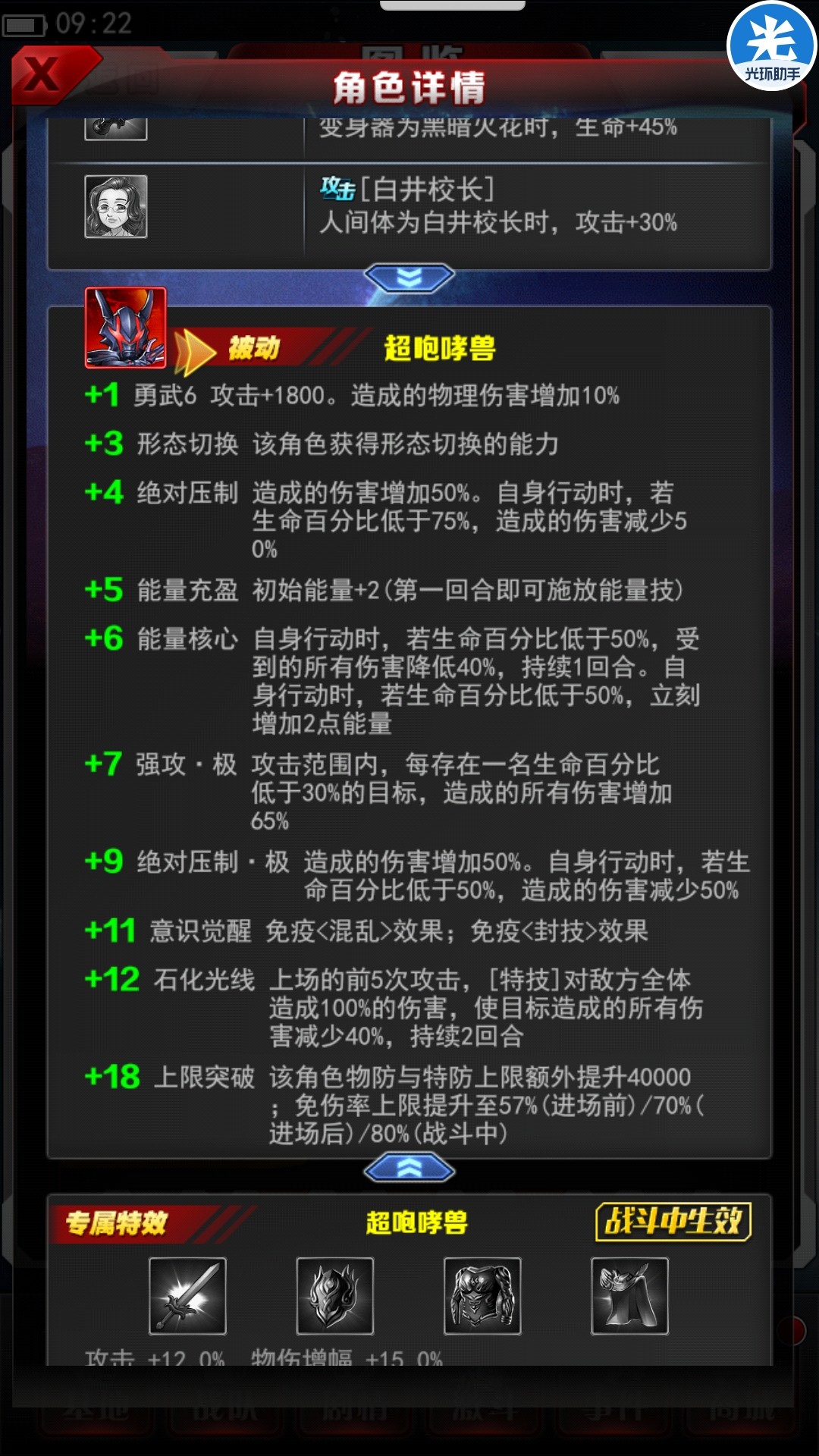 +9被动绝对压制.极造成的伤害增加50%。自身行动时,若生命百分比低于50%,造成的伤害减少50%,这是要完了,这个形态伤害对自身的自残效果太高了,这就是未来怪兽。