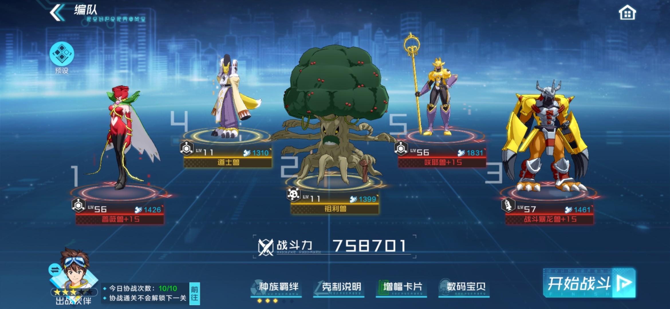 芳香兽开局会攻击我方攻击力最高的,所以战斗暴龙兽会抗伤,防止我方双复活辅助全部阵亡。核心体系为双复活续航中毒磨血。祖利兽大招减蓝(防止对面开大清屏)