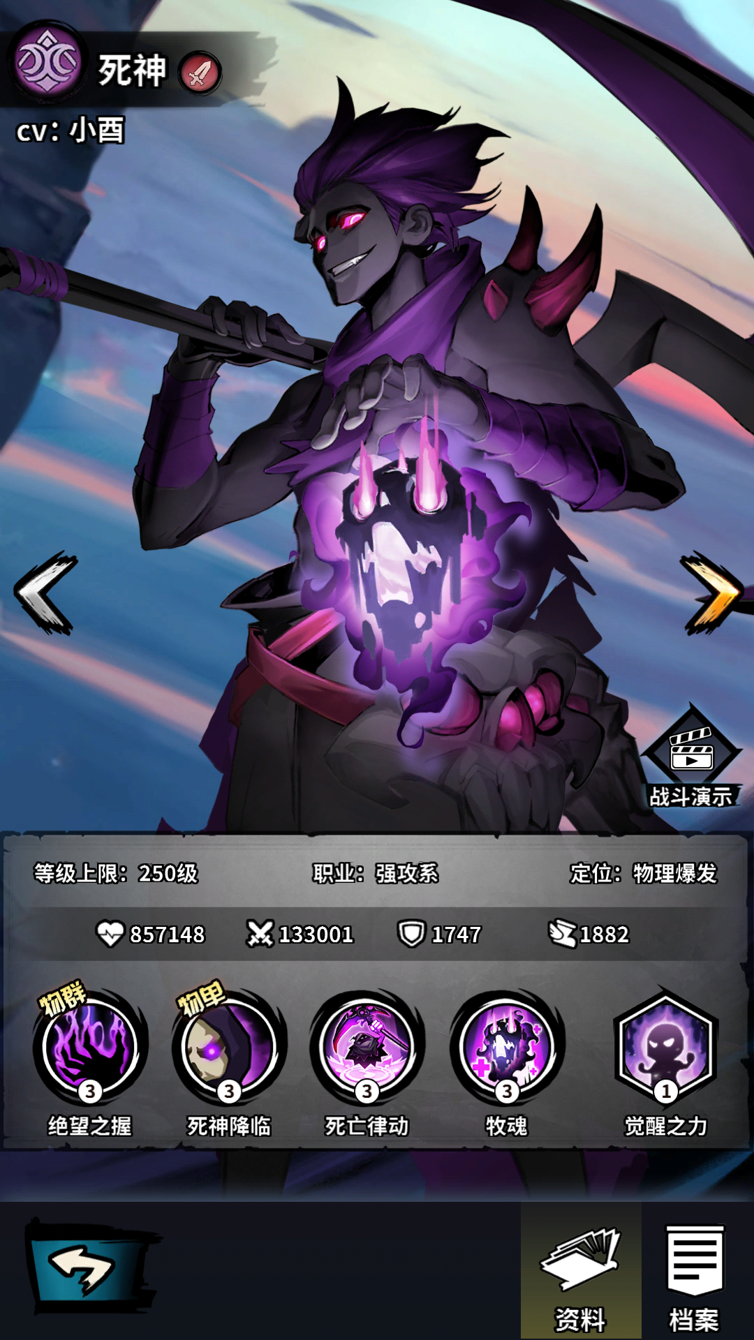 觉醒解析:lv3:释放一技能时消耗生命的50%,转化为护盾吸收同等伤害,持续二回合。对于死神来说,是很不错的一个护盾技能。