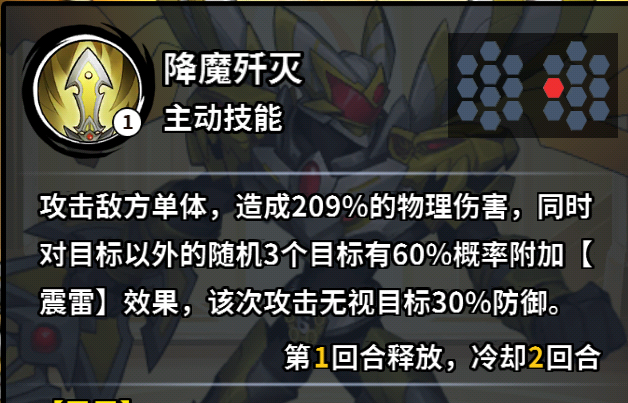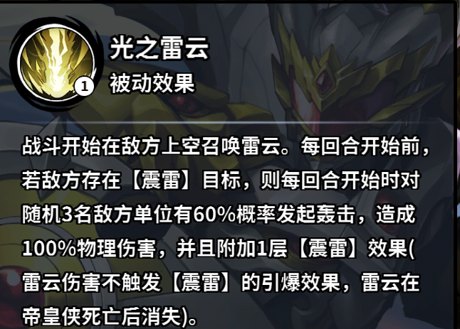 该次攻击优先攻击具有震雷印记的目标。由于第一回合没有震雷印记,所以帝皇侠第一回合的一技能是肯定打在前排的。但从第三回合开始,帝皇侠一技能的就可以优先攻击带有震雷印记的敌人,有可能打到中后排,相对于一些固定以前排为目标一技能,还是稍微灵活了一些。