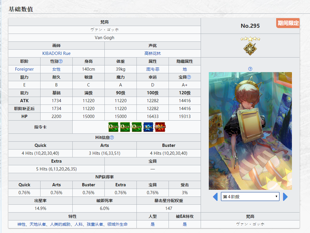 梵高基础NP率为0.76%,指令卡配卡一红一蓝三绿,红卡4hits、蓝卡3hits、绿卡4hits、EX卡5hits,NP率属于较高的NP率,加上自身三绿配卡,绿卡有着4hits,所以打星能力也是比较强的。