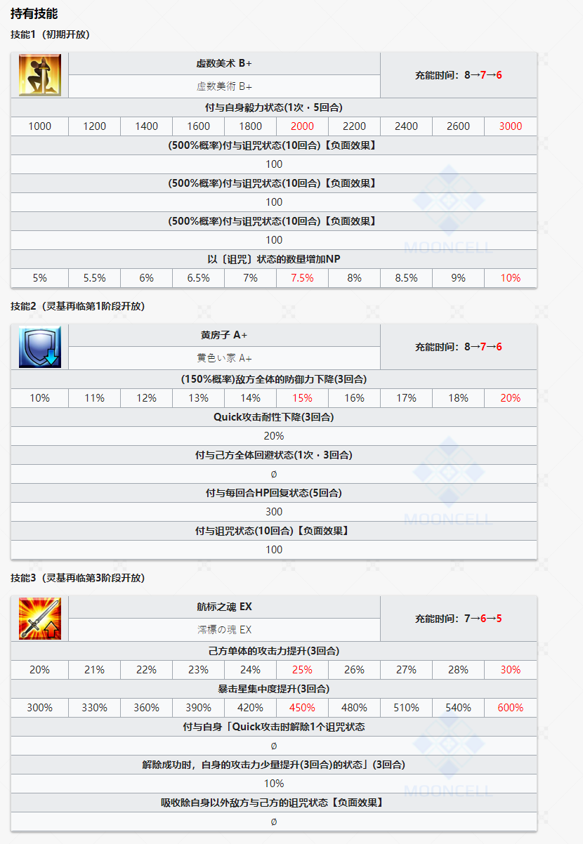 三技能「航标之魂 EX」效果为己方单体20%~30%攻击力提升3回合+300%~600%集星3回合+赋予自身「绿卡攻击解除1个诅咒,解除成功增加3回合10%攻击力」状态3回合+吸收除了自身以外敌方和己方的诅咒状态(该效果定义为负面效果)。