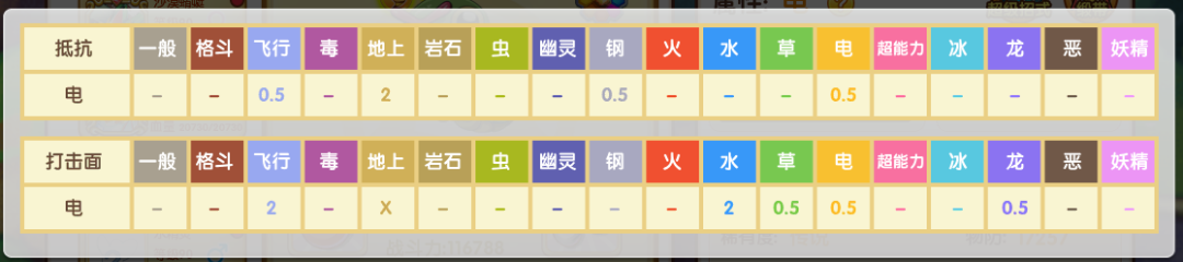 抵抗面:在地属性横行的环境,确实算不上吃香,但地上也是它唯一的2倍弱点。