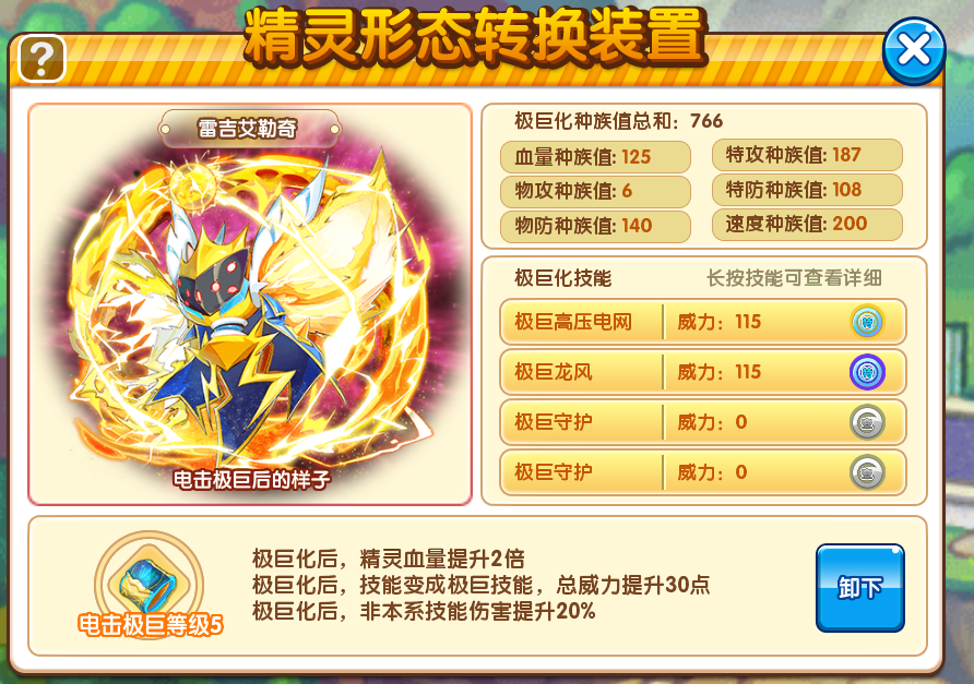 同时它拥有专属的极巨化招式:极巨高压电网,释放电气场地,攻击对手并100%让其陷入【麻痹】,杀伤力极其恐怖。具体效果下文详述。