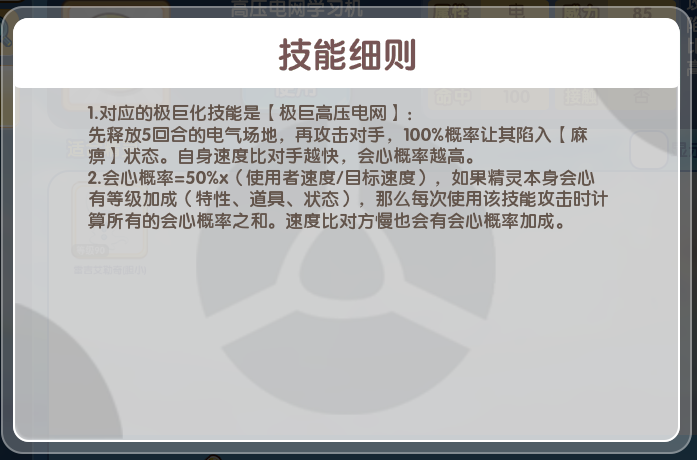 技能效果:先释放5回合的电气场地,再攻击对手,100%概率让其陷入【麻痹】状态。自身速度比对手越快,会心概率越高。
