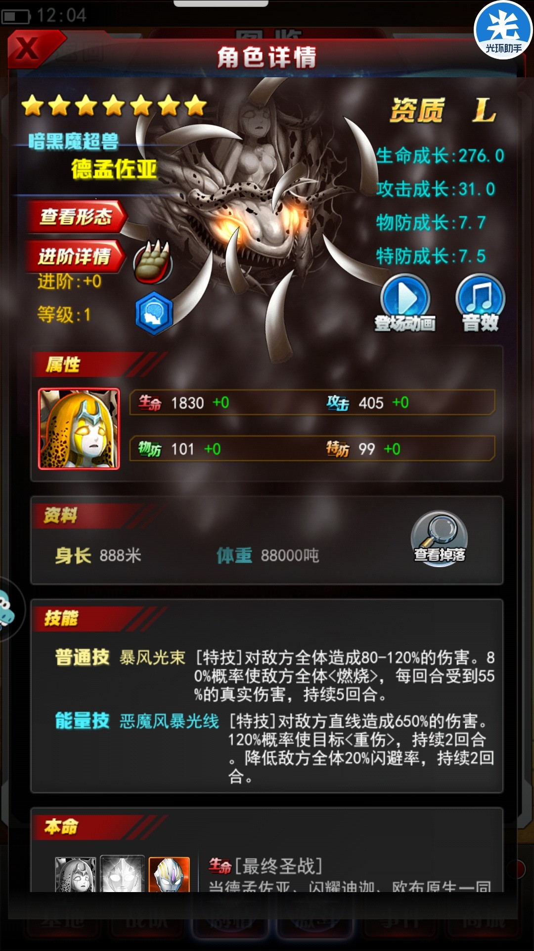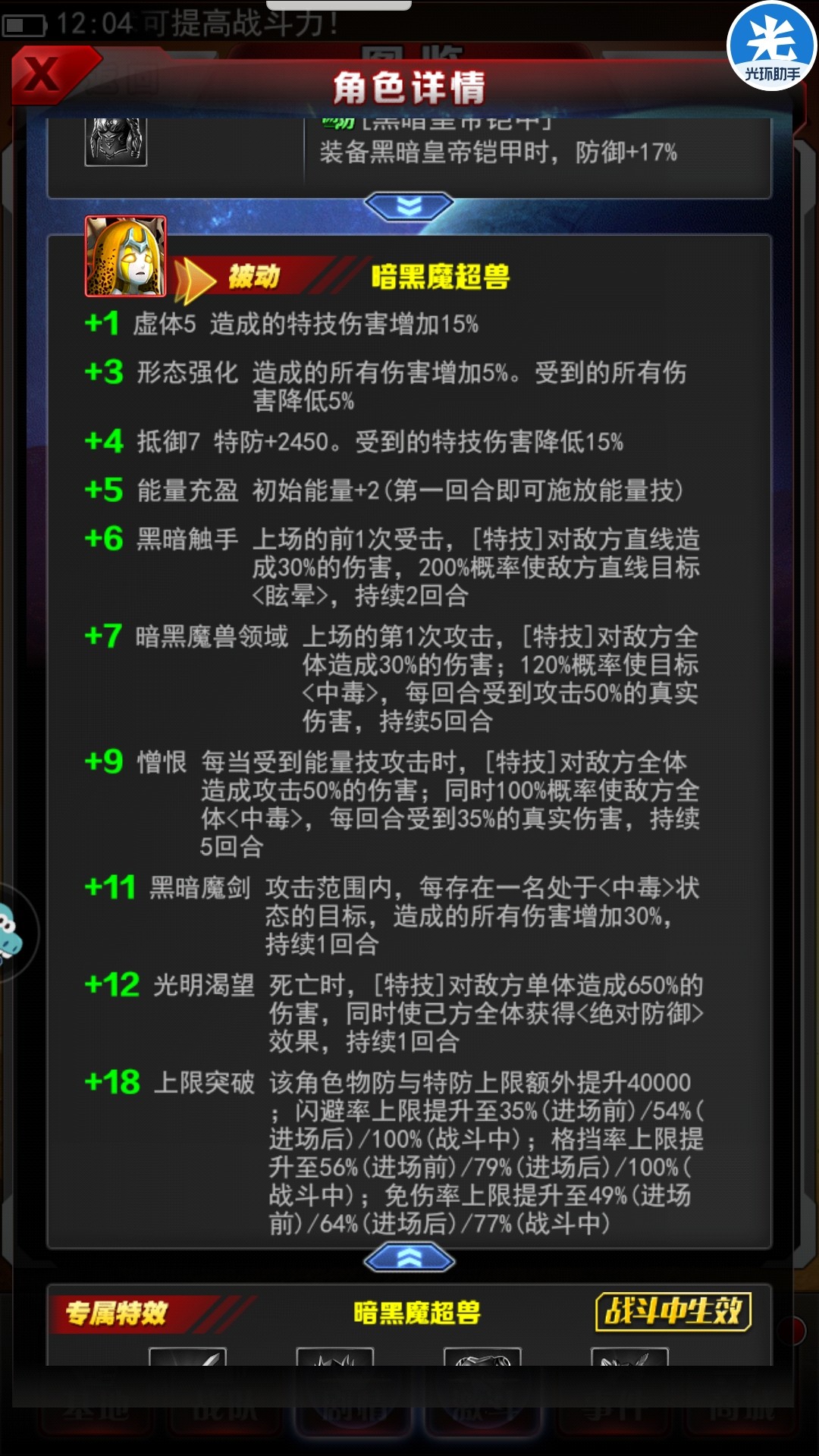 能量技恶魔风暴光线[特技]对敌方直线造成650%的伤害。120%概率使目标<重伤>,持续2回合。降低敌方全体20%闪避率,持续2回合,有650%的高伤,有概率是目标重伤,直线伤害效果超高。