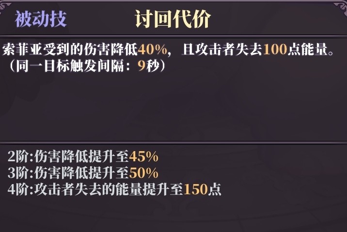 索菲亚受到的伤害降低40%,且攻击者失去100点能量。(同一目标触发间隔:9秒)
