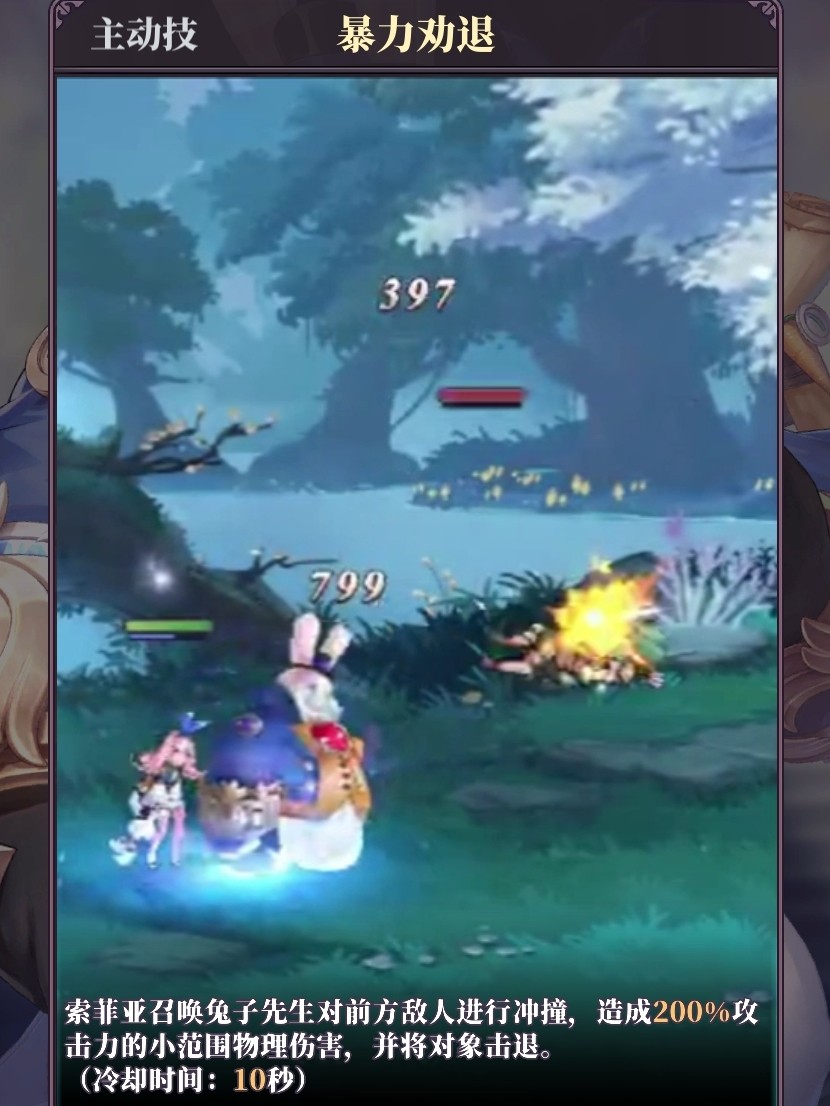 索菲亚召唤兔子先生,对前面方敌人进行冲撞,造成200%攻击力的小范围物理伤害,并将对象击退。(冷却时间:10秒)