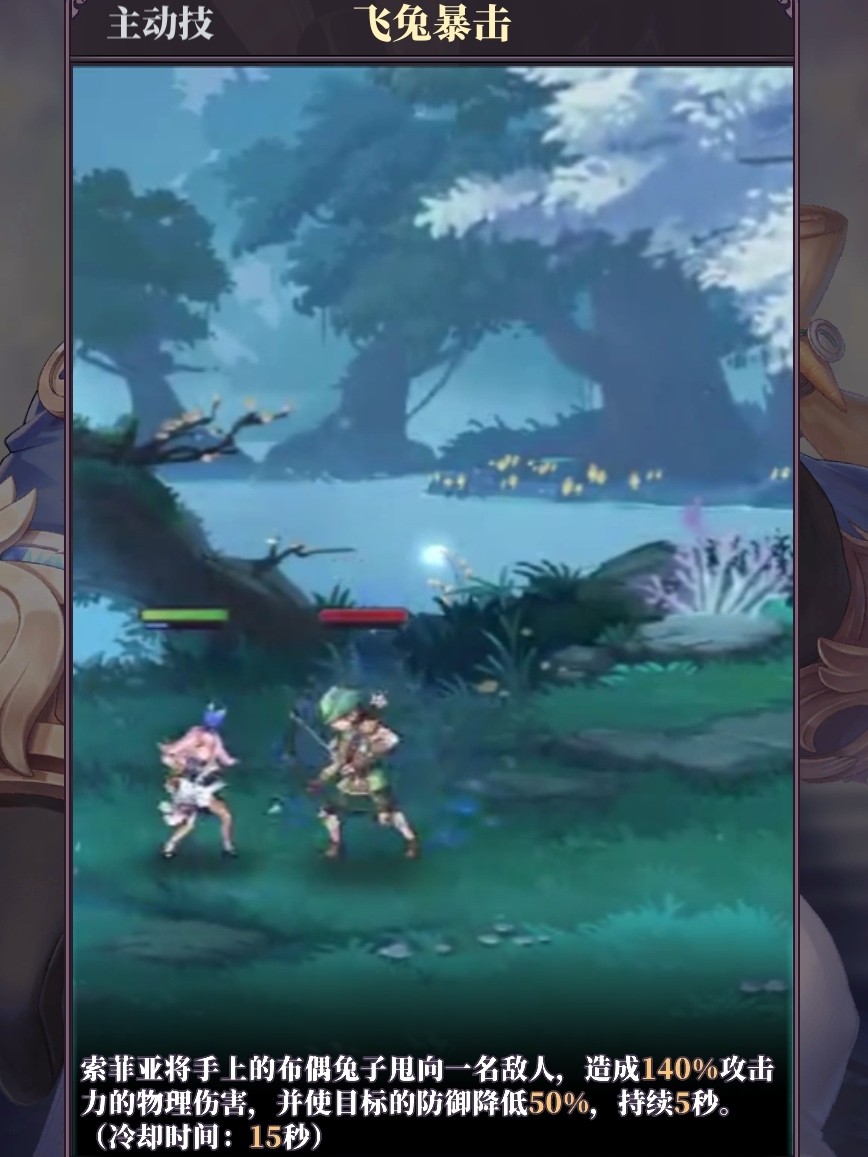 索菲亚将手中的布偶兔子甩向一名敌人造成140%攻击力的物理伤害,并使目标的防御降低50%,持续5秒。(冷却时间:15秒)(光环助手独家首发)