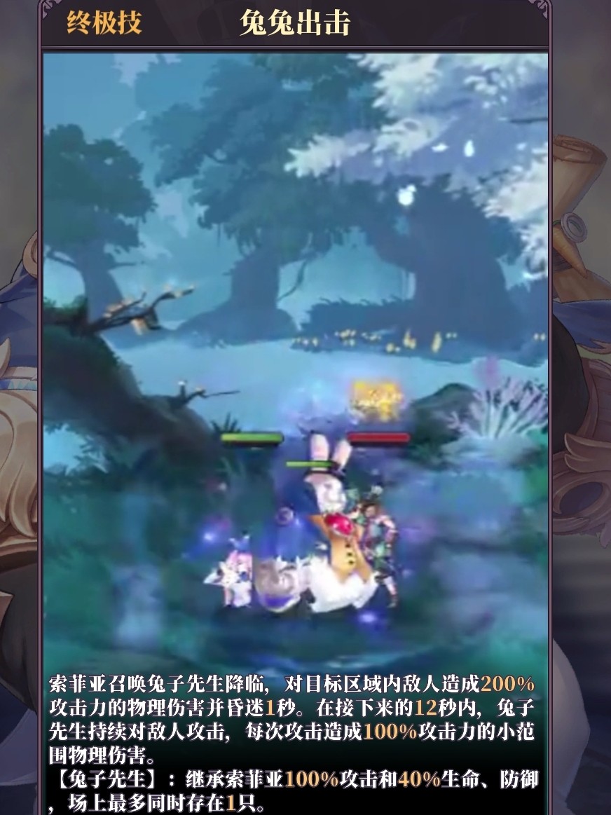 【兔子先生】:继承索菲亚100%攻击力和40%生命、防御,场上最多同时存在一只(光环助手独家首发)