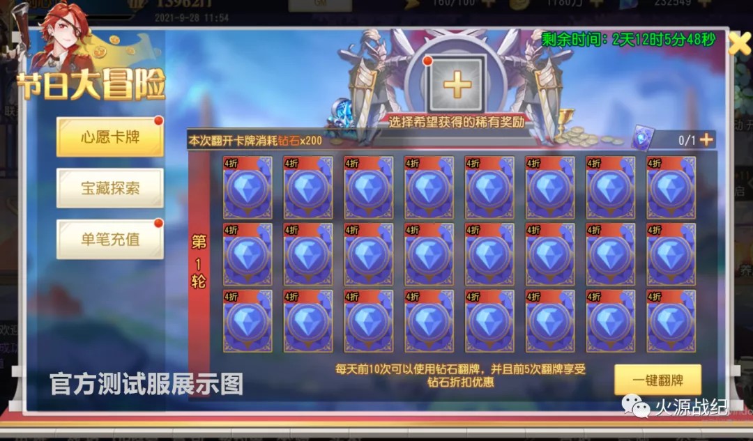 每个总长大人内心肯定都有属于自己的心愿单吧!为了实现总长的梦想,千岚这次带来了全新的心愿卡牌。活动期间,总长大人可以挑选属于自己的专属心愿进行翻牌,每一轮专属心愿每天前5次翻牌享有钻石折扣优惠,更有超值的单笔充值礼包可以购买哦!