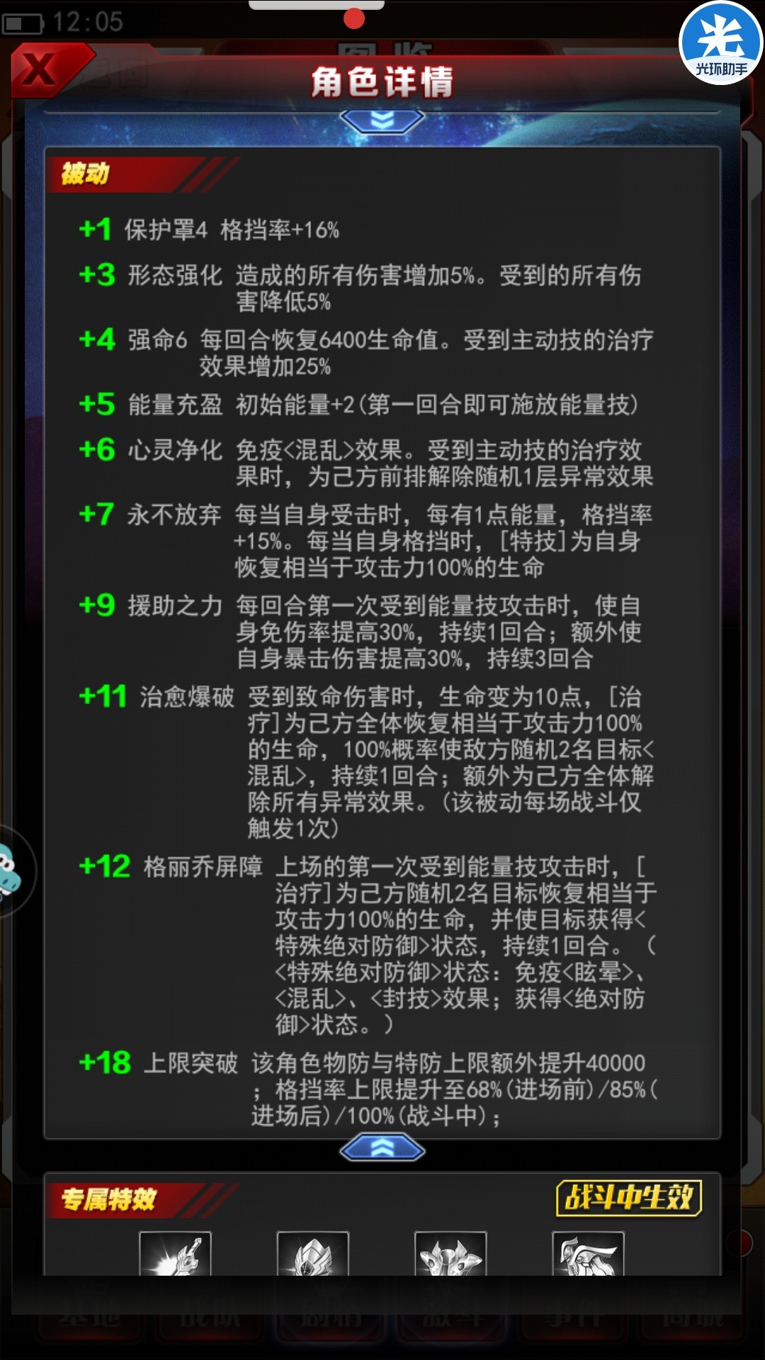 +9被动援助之力每回合第一次受到能量技攻击时,使自身免伤率提高30%,持续1回合; 额外使自身暴击伤害提高30%,持续3回合,对于自身有加强效果,但是对队伍没有辅助效果。