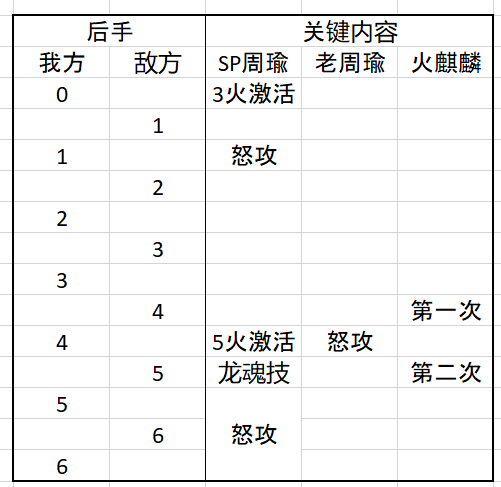 敌方4号位行动后灼烧扣血 触发第一次火麒麟;我方老周瑜4号位普攻后怒攻引爆(通过推算 这个时间点SP周瑜5火吸血可以激活)