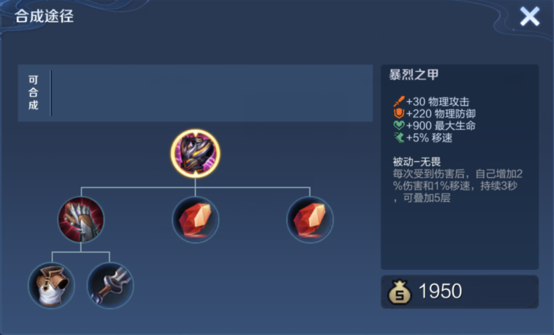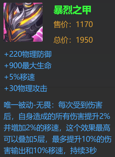 首先我们从上图的属性看到,其有着物攻30,以及220的防御,最重要还可以增加900生命值同时有5%的移动速度加成,这就带来了装备它的英雄可以有一定程度的坦度,同时带来可观的灵活性(移速、机动),且还有概率的伤害,可以算是比较综合均衡的一件装备,那么适合暴烈之甲的英雄有哪些特点呢?首先第一肯定是对移动速度有一定的要求了,其次是被近身以及自己需要近身的,还有就是团战输出以及扛得久的(坦度)。但是要注意的是不是因为现在出它的人多就一定代表它非常强,只是因为出它的英雄目前就只有这一些。