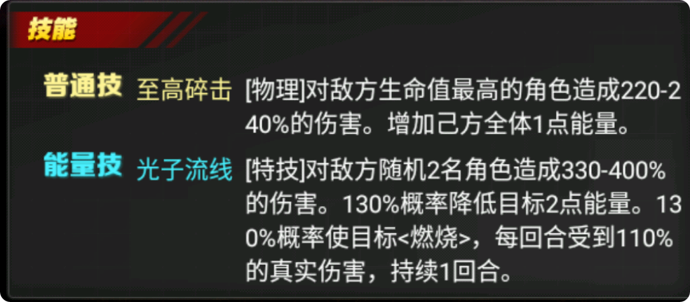 然后是能量技[光子流线]:对敌方随机两名角色,造成330%~400%伤害,130%概率降低敌方两点能量,同时造成燃烧,燃烧伤害为110%真实伤害