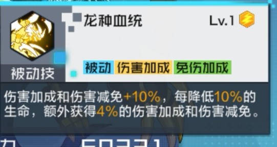 伤害加成与减免加10%,每降低10生命额外获得4%的伤害与减免加成。(核心技能,有这被动直接pvp中t0,没有这被动pvp下水道。一个被动拯救了这条龙。)