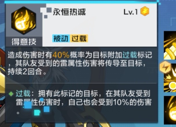 造成伤害时,有40%概率为目标施加过载标记,无视效果抵抗,(标记不是异常)过载的效果是当有此标记时,队友受到雷属性伤害时,自己受到本次伤害的10%。