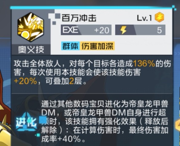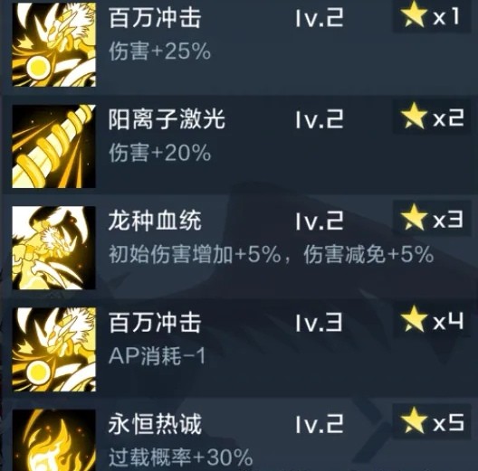 一破伤害增加25,配合被动的增伤与减伤是一次小突破,4破的大招已ap减一是一个质变,参考战斗暴龙兽。一个能量影响至关重要,5破过载概率大幅增加,雷队核心。