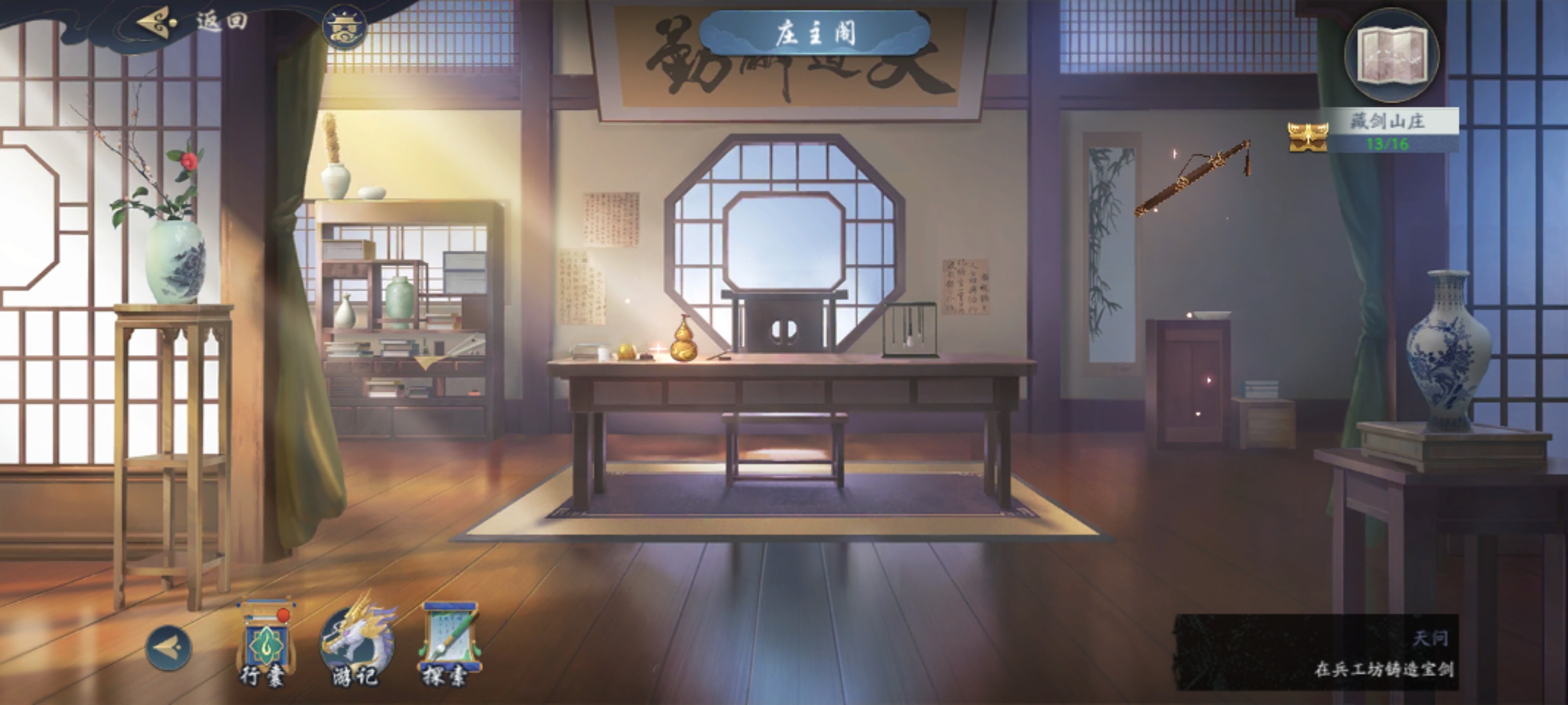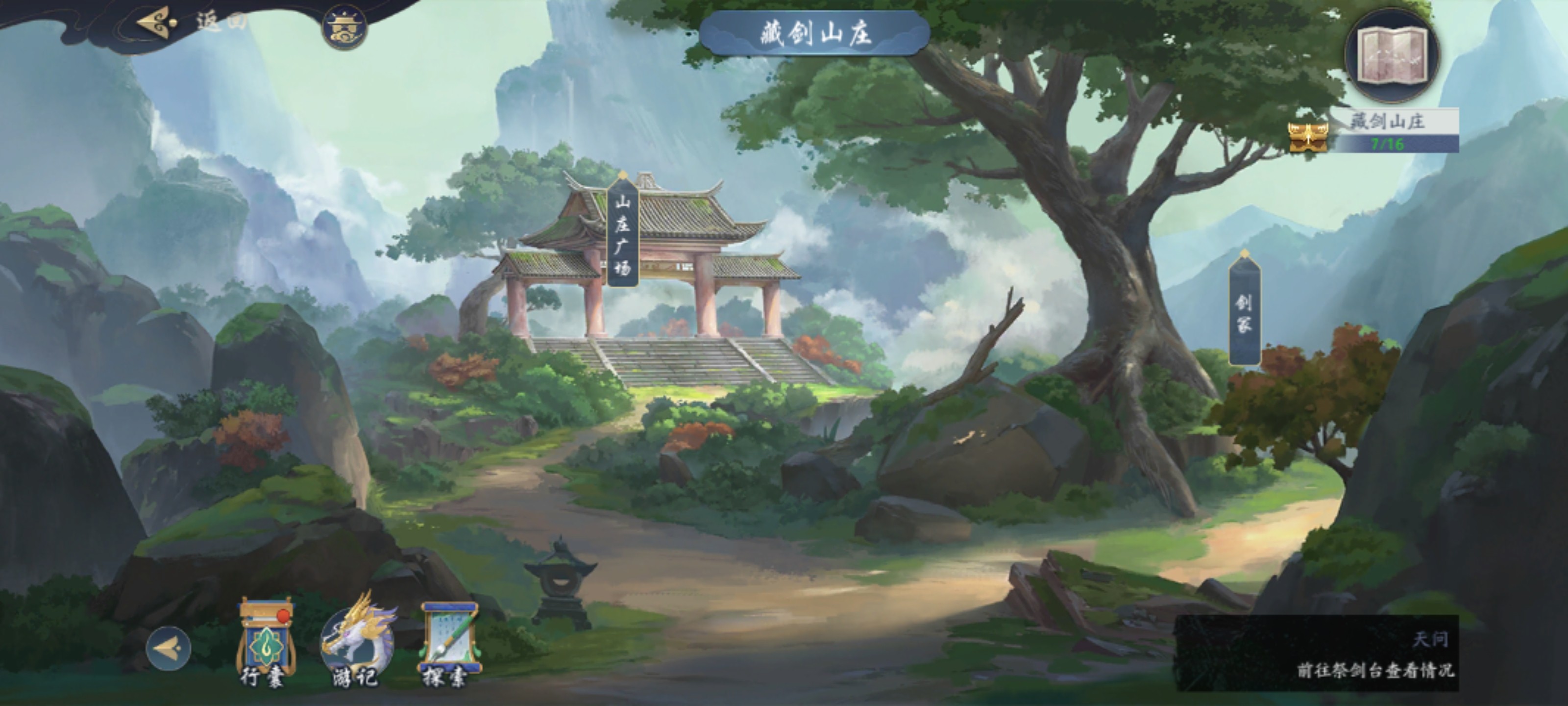 进入山庄广场找藏剑长老对话开启庄主阁,山庄正殿等场景