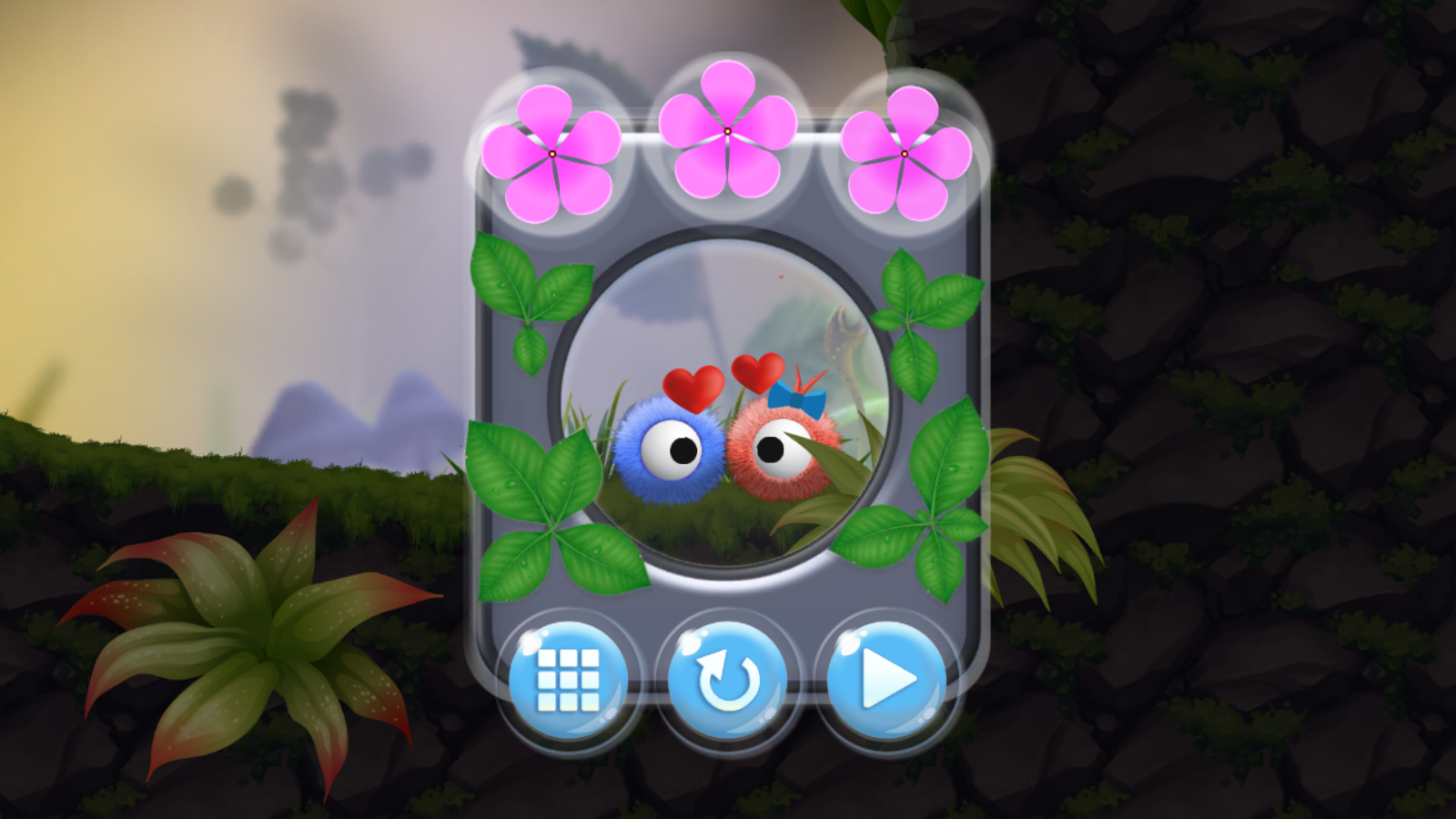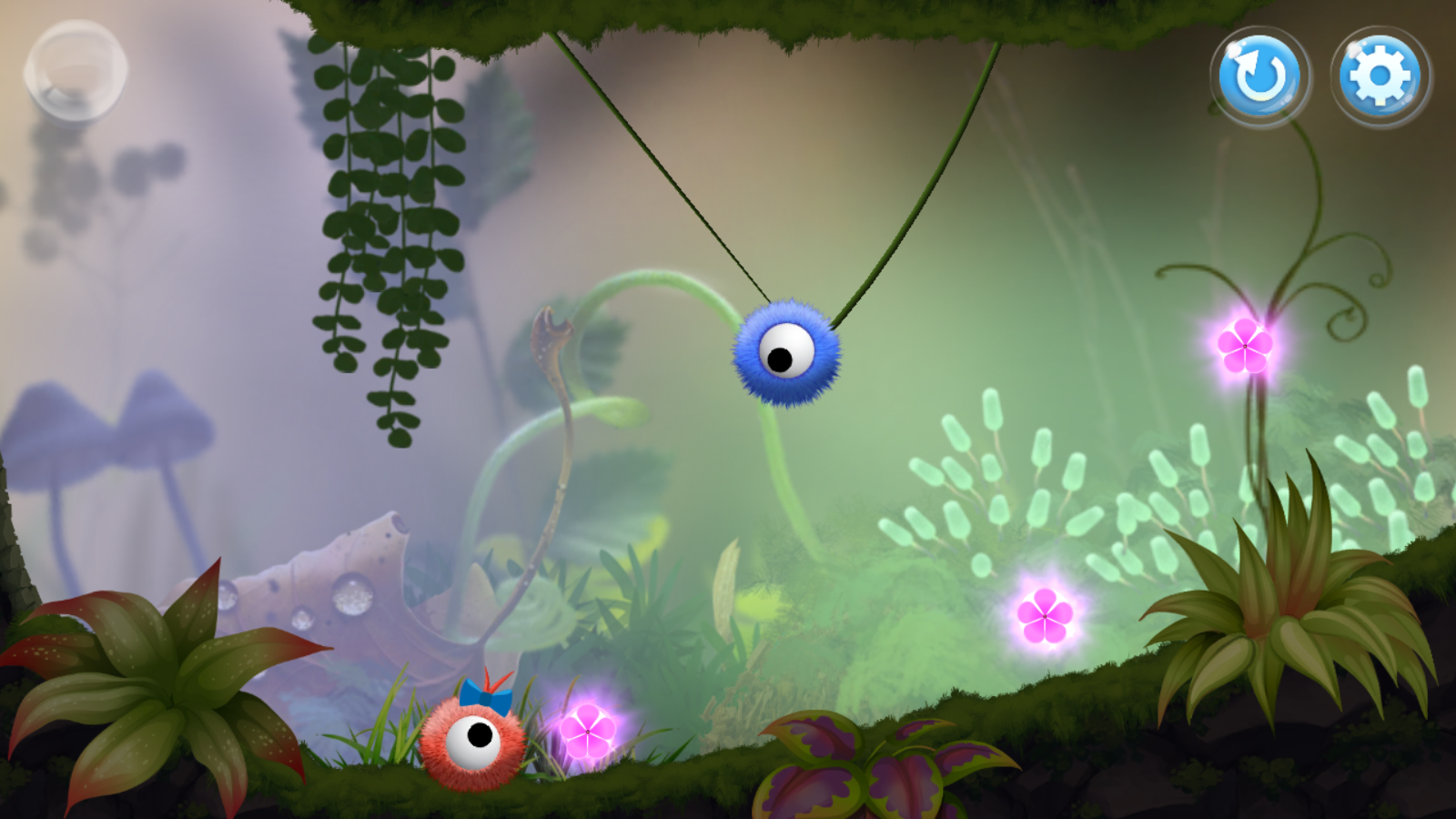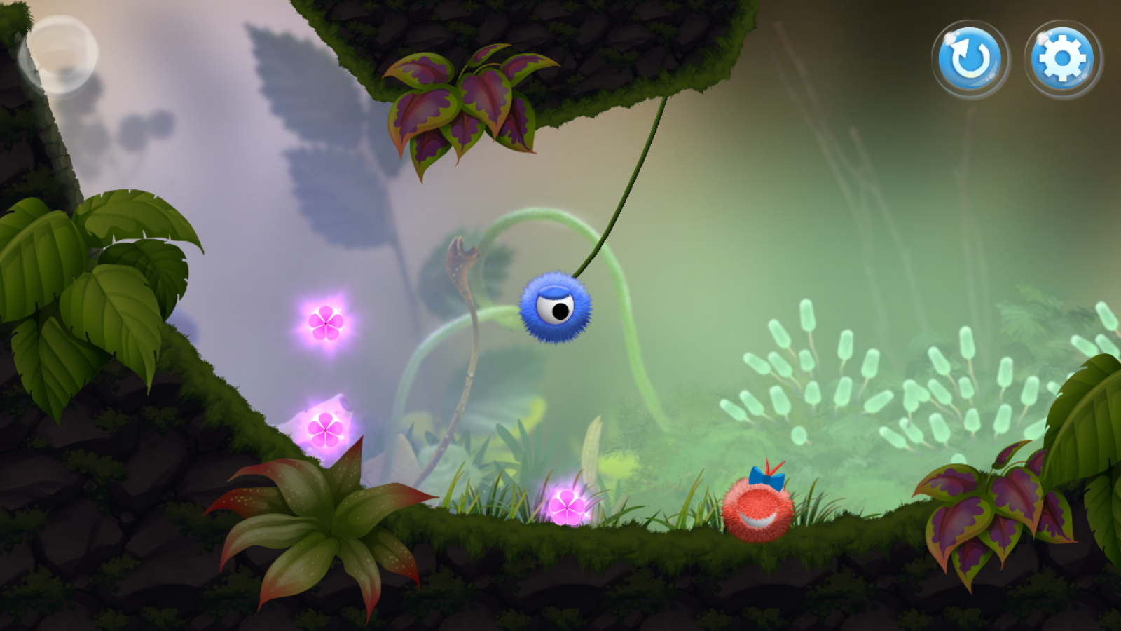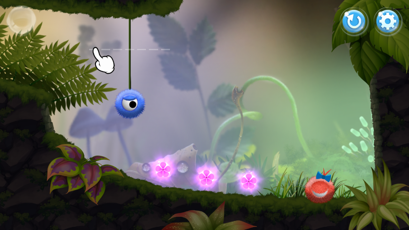 游戏非常的简单,玩家只需要割断蓝色小球头上的蔓藤让他能够到达红色小球的身边即可通关。在路上,玩家可以帮助蓝色小球收集粉色小花,整个场景里只有三朵花,如果做到全收集,那么这关就是完美通关。
