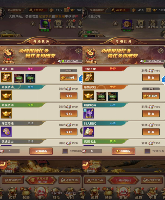 第二天肯定30级以上了,30级开启千里单骑玩法,80w战力可开启精英模式,120w战力可以开启噩梦模式,所以战力很重要,但是也不能乱升星,乱升星容易打不完15关,优先升带治疗的坦克,不然续航跟不上,所以新区普遍是太史慈和张飞开局,这样比较方便获取资源,无论是千里还是血战还是爬塔等等,这两武将都很不错。通关千里可以可以获得威望,可以用来兑换五星武将和五星随机碎片,噩梦全部通关能够有6875威望,而普通模式只有2125,精英模式只有4500,差别非常大。