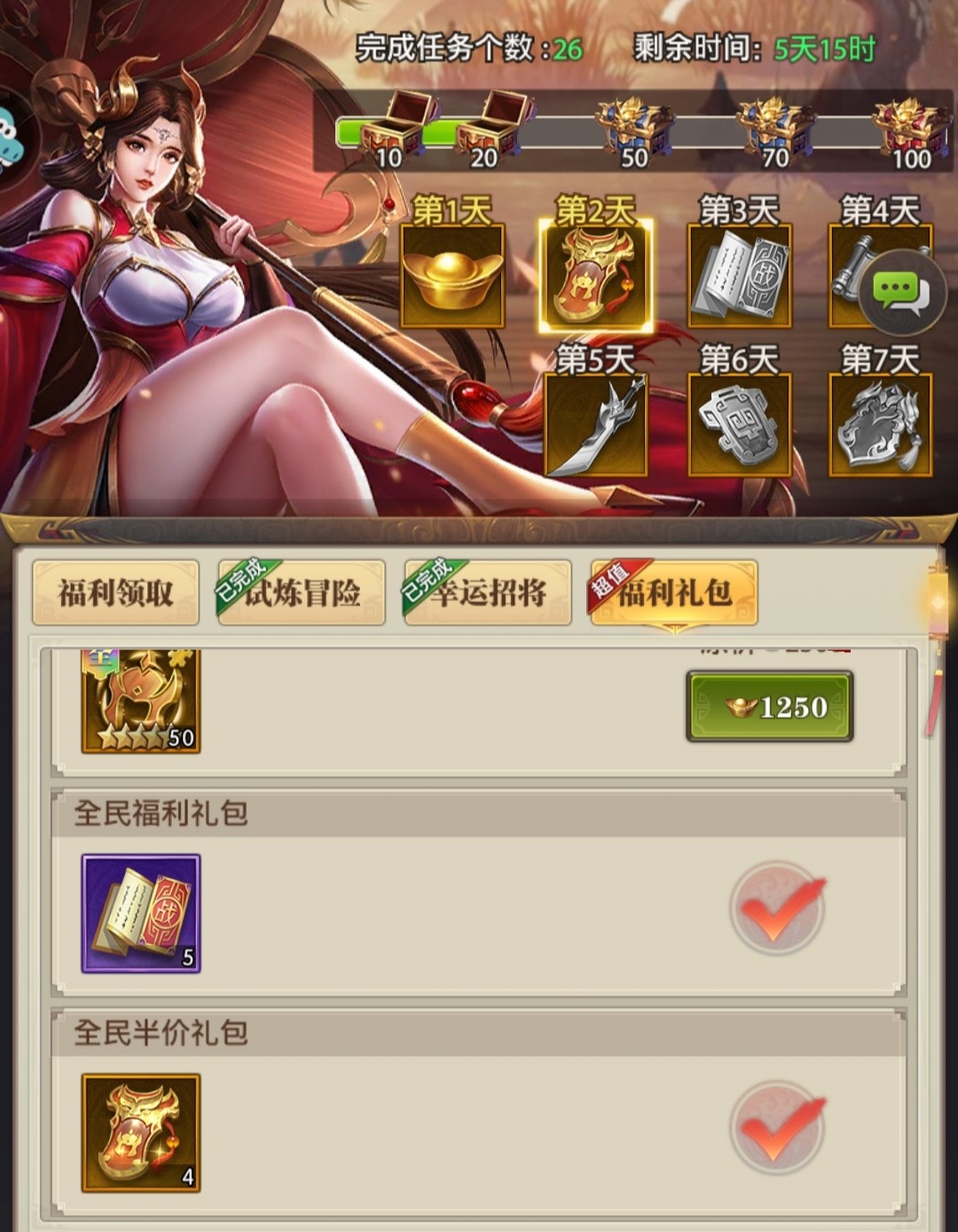 再把每日任务做一下,领完每日任务奖励获得一个高抽。顺便把七日演武的第二天的高抽令牌买了,价格一般,能接受。基本七日演武活动里的任务都是每日的要做的任务,不要慌张七天完不成。记住高抽一定要积累到十连才抽,因为十连必出五星,单抽没有这个保底,不要因为一时忍不住深陷单抽的泥潭无法自拔。