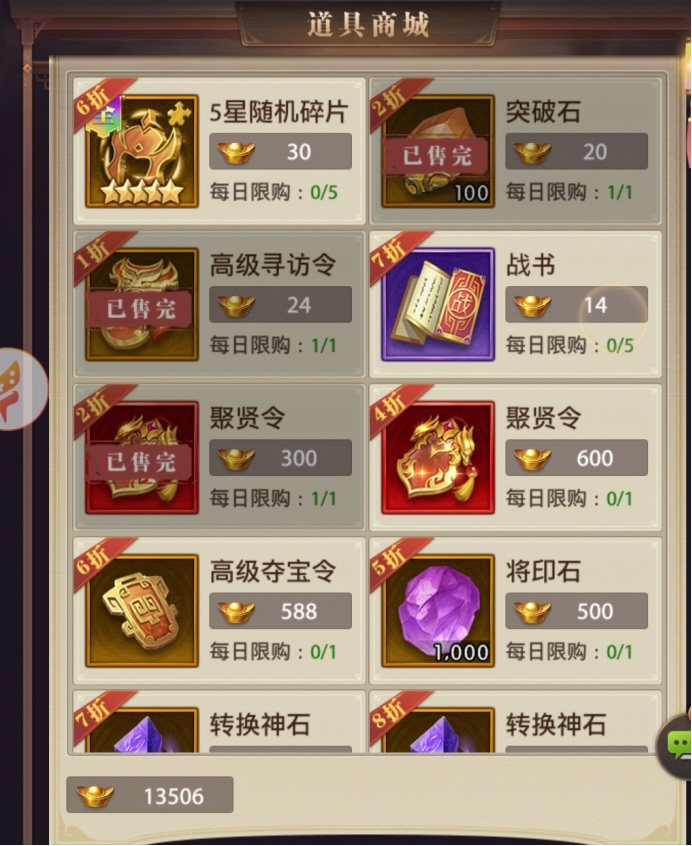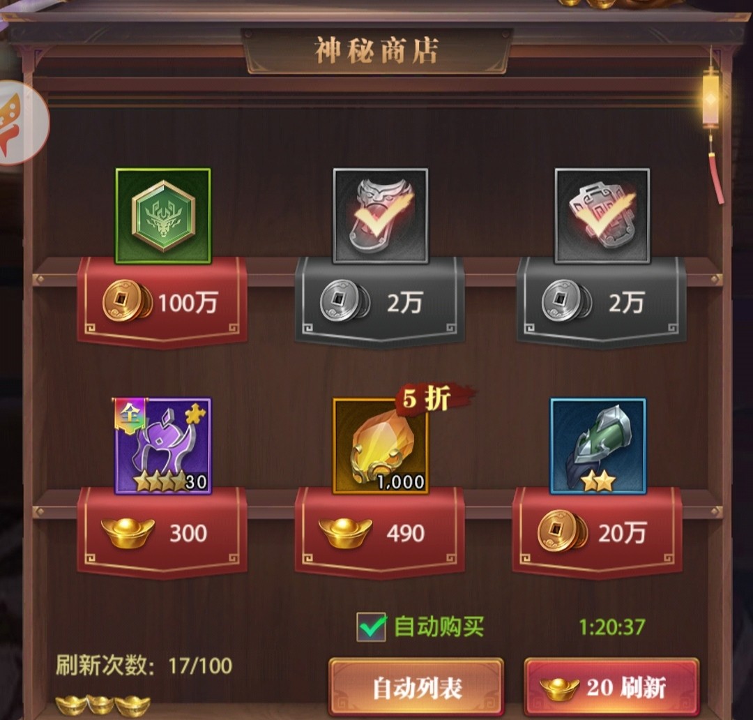 再把神秘商店刷一下,把突破石这些东西买完,前期还是缺得狠。你发现如果买完了突破石还是差一些,可以适当用元宝刷新神秘商店,用铜钱购买,可以说,游戏第二大货币就是铜钱,尽管很常见,但是却是不可或缺的。
