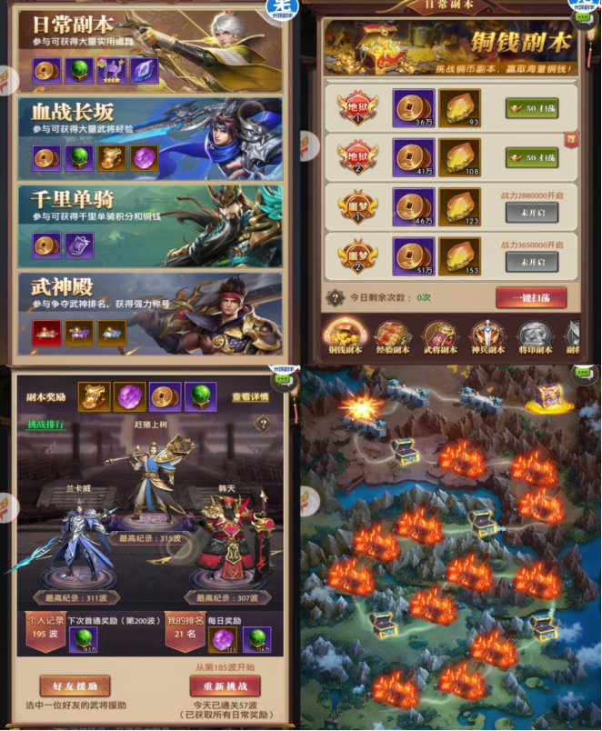 而且日常副本是通过战力解锁的,首次通关不消耗次数,不过有些即使你战力到了也打不过的副本也不用强求,不打就是了。所以前期获得的聚贤令最好是都用完,获取五星武将升星提升战力,让通天塔等副本层数更高,自己收益越高,这才是最好的处理方法。