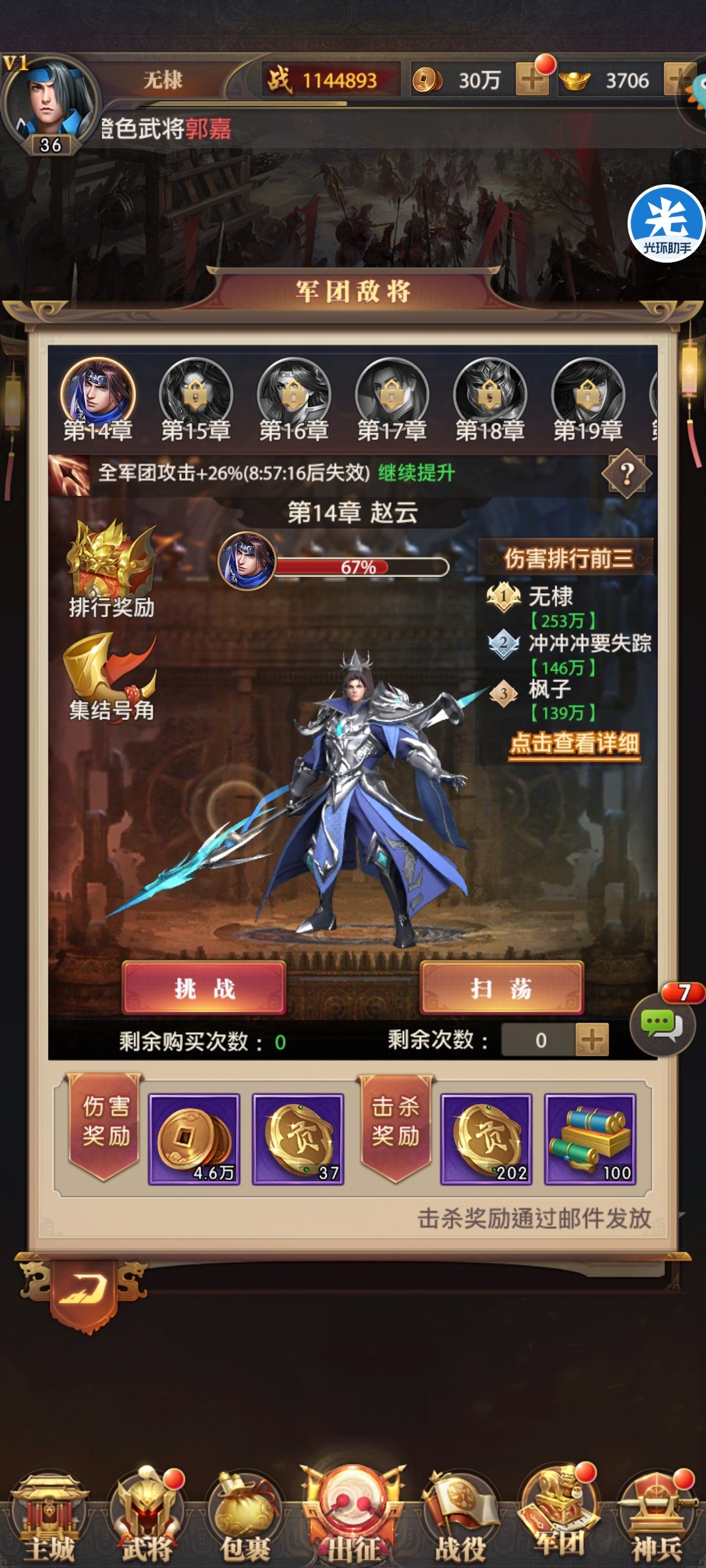 把自己的战力提升到最高,再去打军团boss,尽量获得较高的排名,如果发现自己的军团开始变得不活跃了,建议主动联系活跃的军团果断换掉,升星缺狗粮也可以去军团商店里兑换,开始不用升太高的军团技能,因为实际提升不大,军团前期掌控的主要是速度。速度很重要,决定武将出手先后,暂时就不说了,因为篇幅太长。