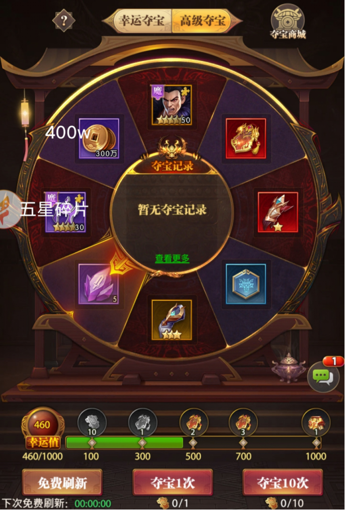 30级还开启高级夺宝,高级夺宝里面好东西还真不少,建议当左边是五星碎片或者左上是400w铜币的时候再用,这些都很好。没有就等刷新,千万不要急!