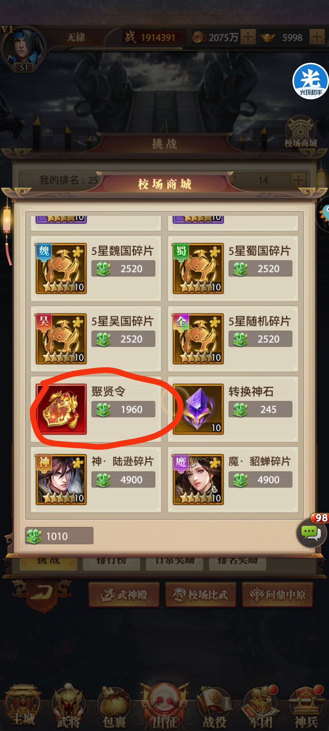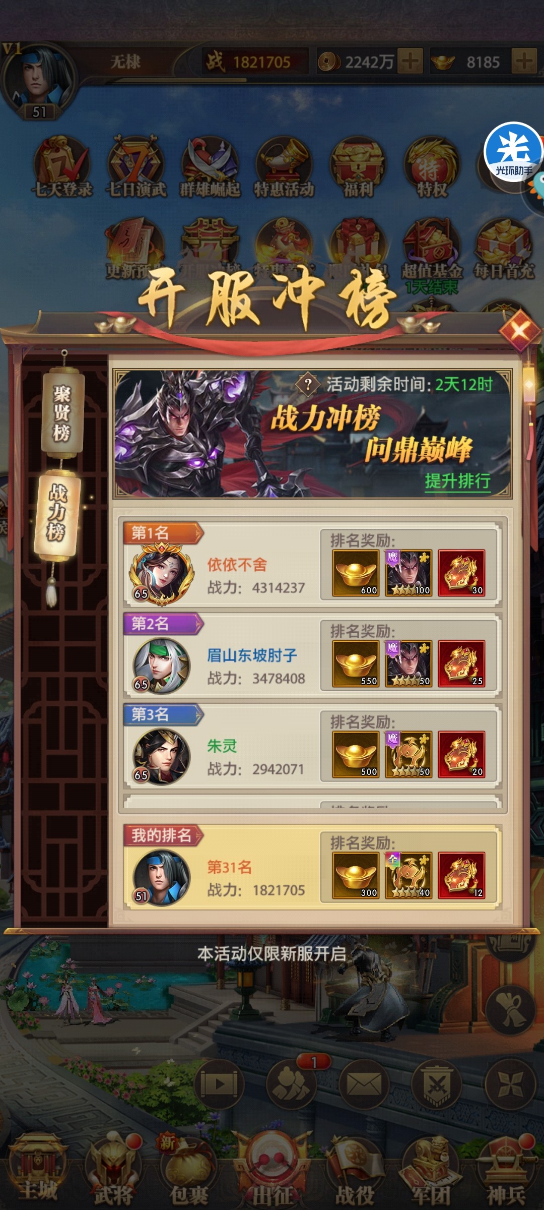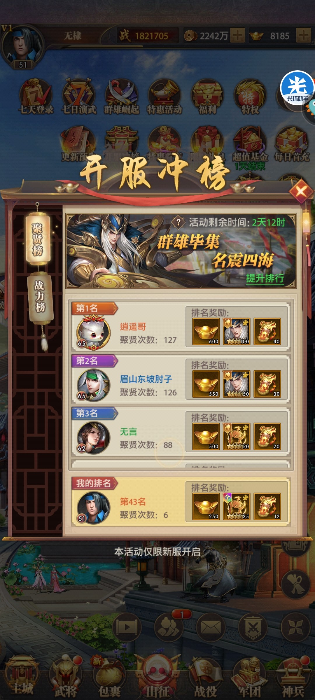 玩铁杆三国已经第四天啦!那我们该干点啥呢?今天上线先把邮件领一下,因为前三天的等级和招募排行榜结束,奖励发放了,虽然只有一些五星碎片,但是保不准出好武将,又是看脸的一天(ˉ▽ ̄~) ~~(不够的话可以去千里商店和军团商店换一些)同时,又开启新的排行榜啦!这个榜的奖励更加丰厚,也是最后一次,可谓是神仙打架啊!