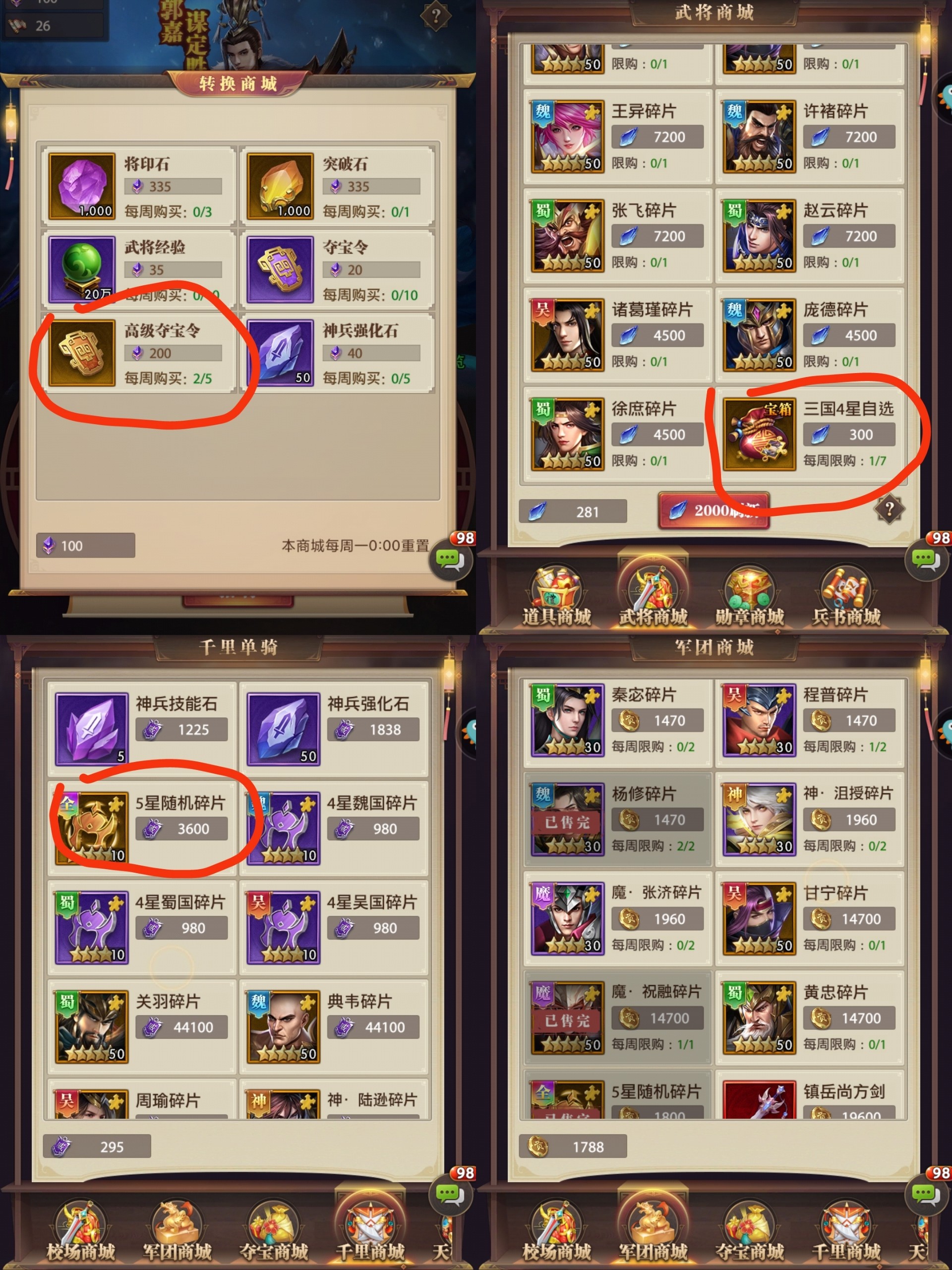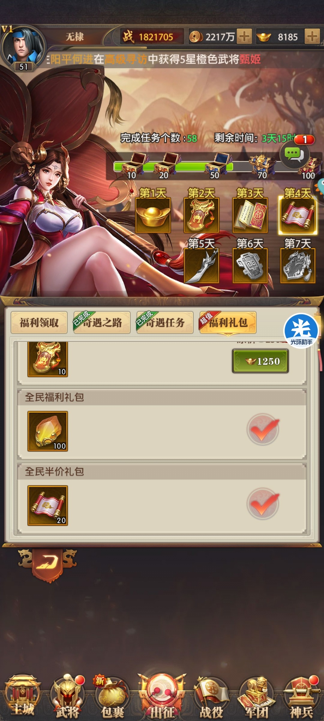 老规矩,后面就是发育(领挂机经验—刷奇遇任务—打剧情boss—快速作战拉满—做日常任务—刷新夺宝—刷新神秘商店—商城购买)日常流程走一套,希望能刷出红色任务~虽然流程是有些枯燥,但却是发育必须要经历的,还希望各位小伙伴耐住寂寞,好好发育,争取早日培养出属于自己的阵容!今天七日演武的奇遇刷新卷可以买,不亏。