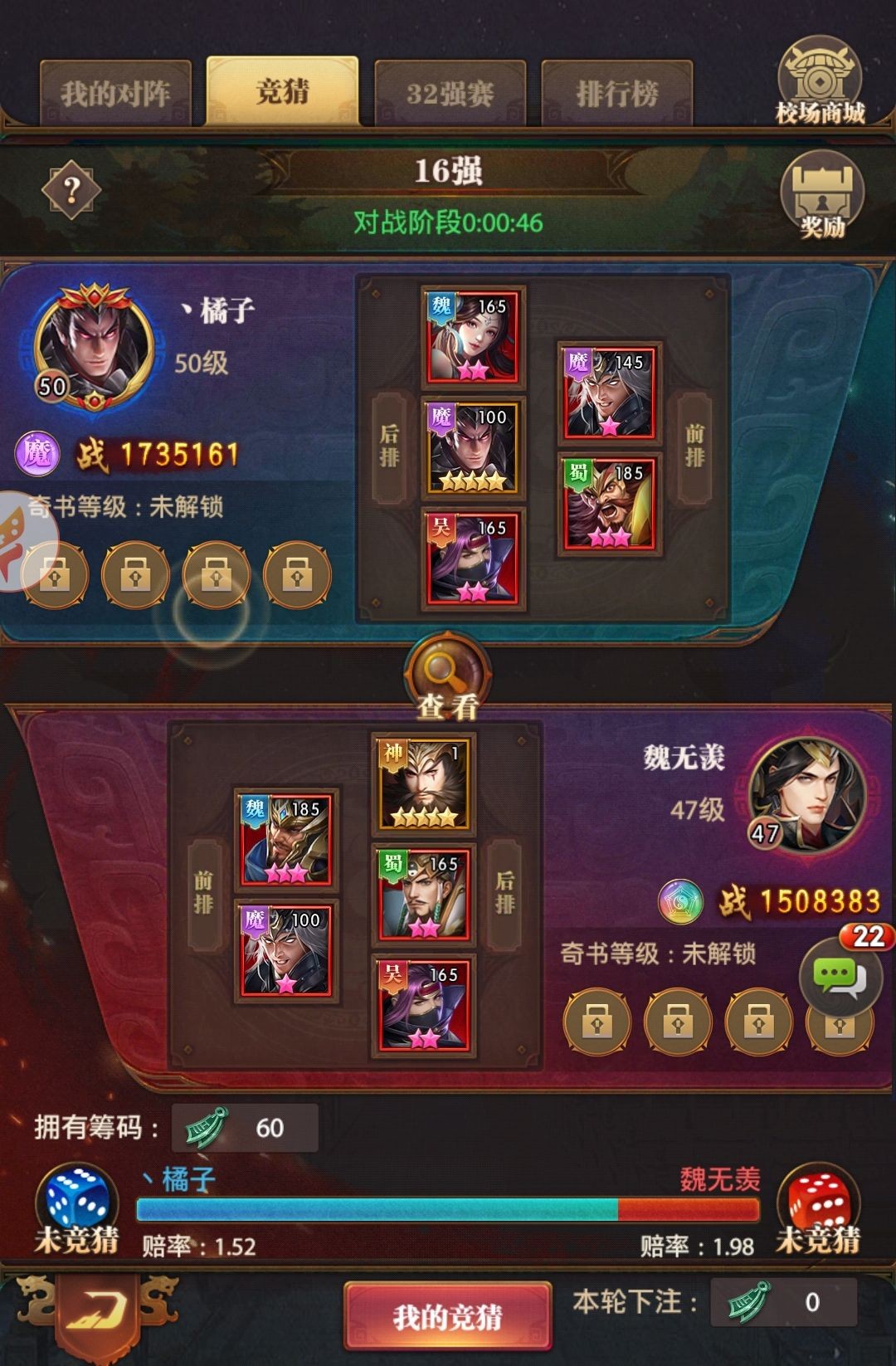 在这里,充分体现出玩家们的实力:独特的武将站位以及阵容搭配,强悍的氪金能力,以及不少玩家低战逆而伐天,强势越战,十分精彩!当然,作为新手的你可能没什么经验,这不是问题,去世界聊天问问别人猜那一边就好,但翻车现象也不少,下注要谨慎啊,果断就会白给,犹豫就会败北,哈哈哈~竞猜有句老话:竞猜反着买,别墅靠大海!你自己体会体会~可以说竞猜是这游戏后期少有的乐趣了。