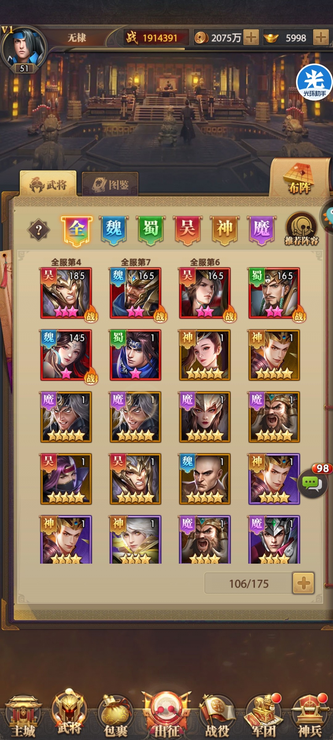除了问鼎,你也应该考虑一下自己的搭配问题了,前期是无脑升坦克,但是后面你要玩什么?在阵容上面大家只能给参考,已有的数据,跟着走确实可以少走弯路,但是这样玩确实没意思。目前都说神魔强,但氪金量也是一个问题,氪不够神魔也是弱鸡,因为配置差,你得花很多资源,却不一定能得到对应的回报,神魔聚贤出5星比较难。单养一个是没什么问题,但由于天赋的以及加成,往往是纯色阵容多,也就是全神或者全魔,或者全吴等等。混搭阵容也可以,因为纯色阵容同阵营狗粮需求量大,也需要混搭过渡。