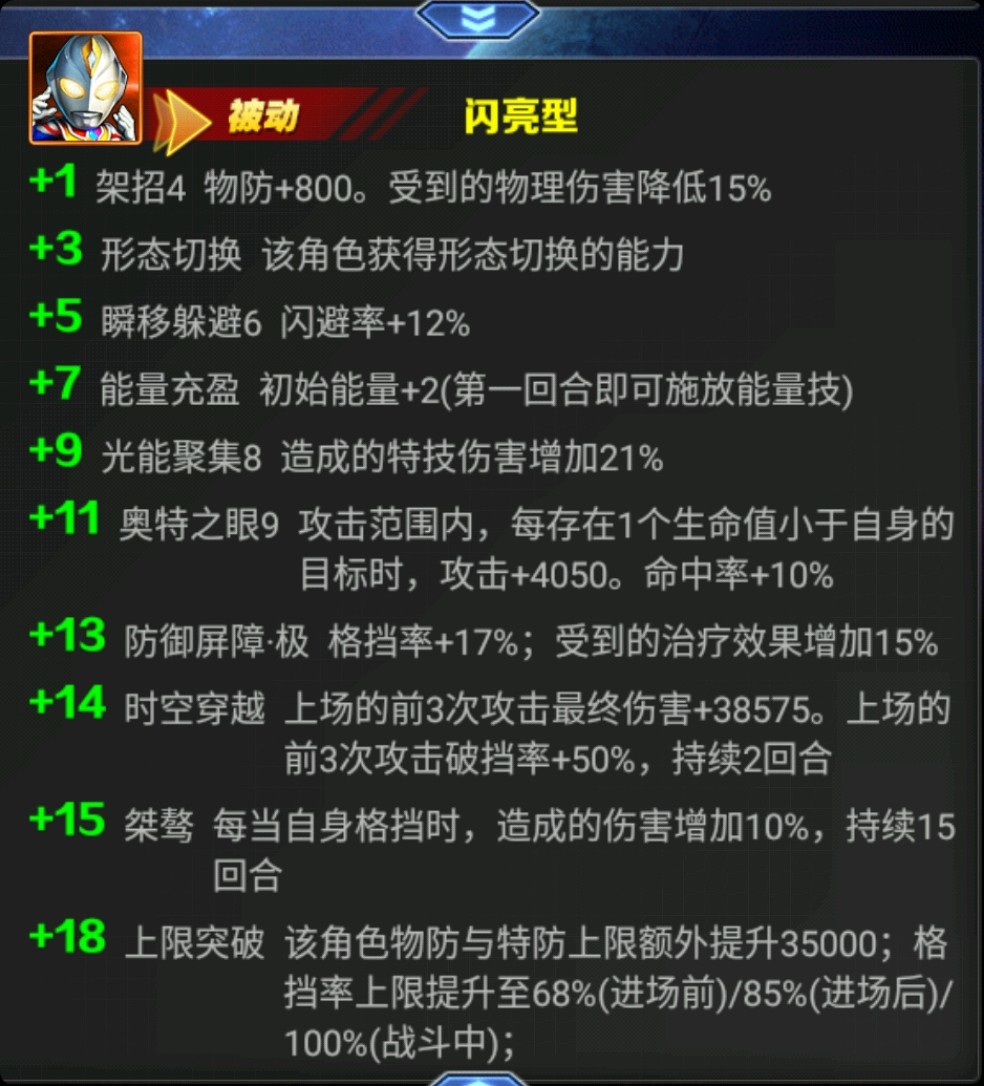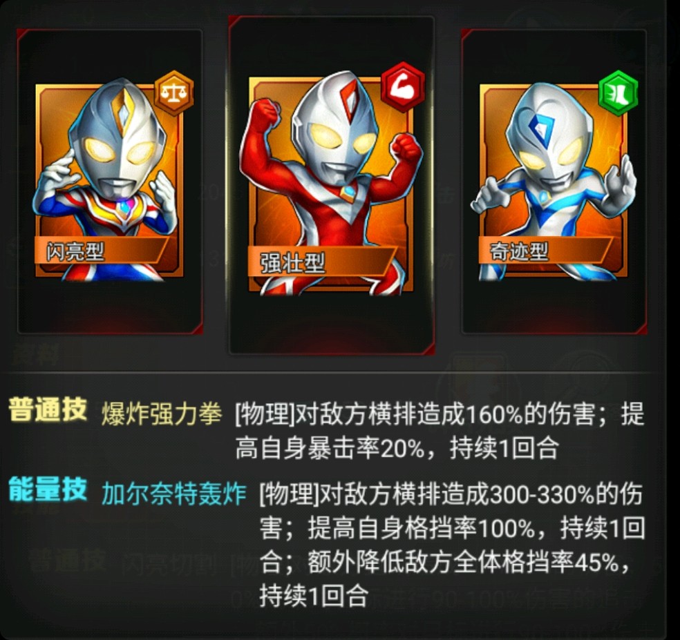 格挡后期可转型角色(限多宇宙):大地罗索,维克特利圣骑士,钢铁9号,迪迦龙卷型,闪光戴拿(最为推荐),高斯,盖亚(平民推荐),大地布鲁