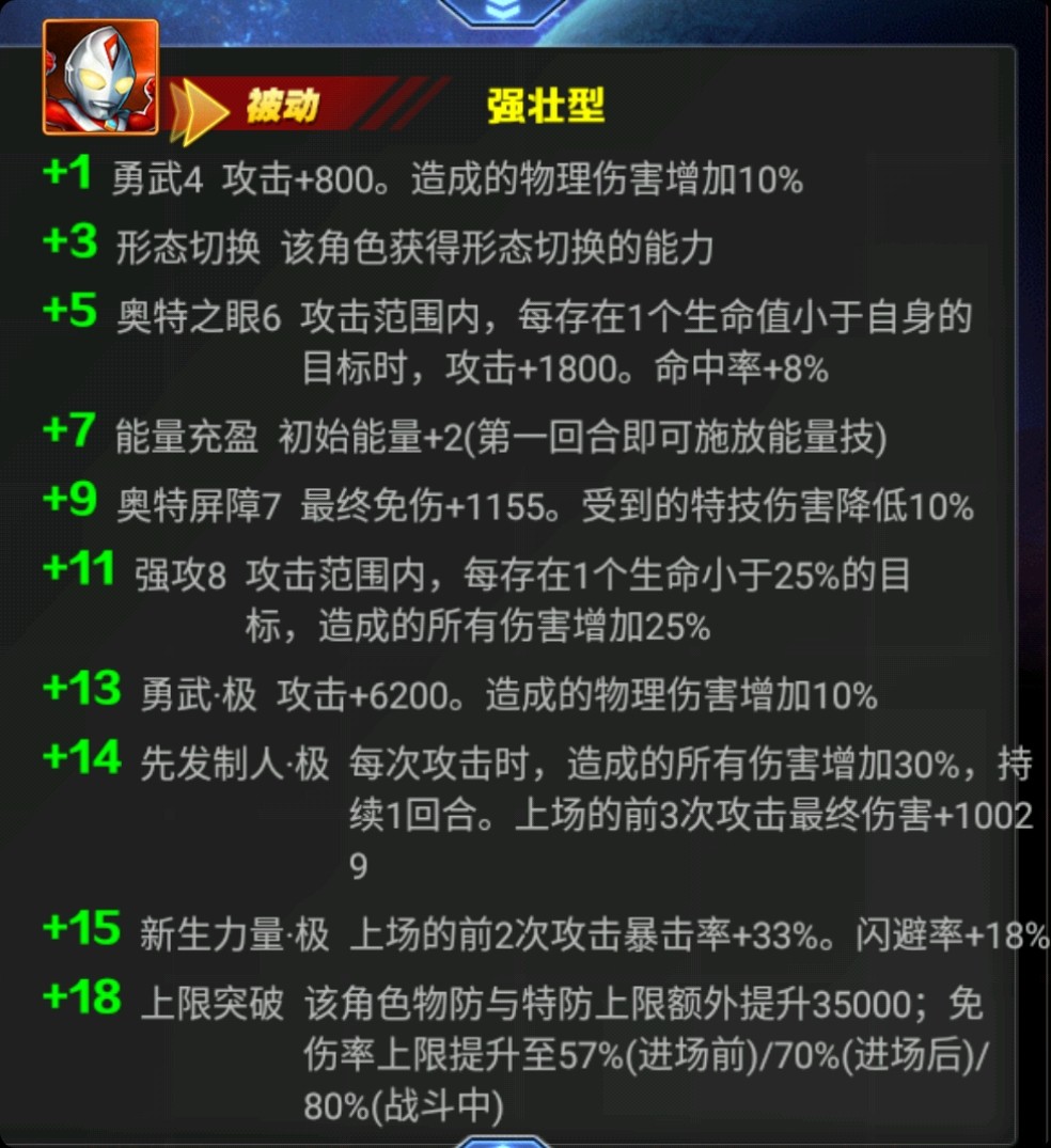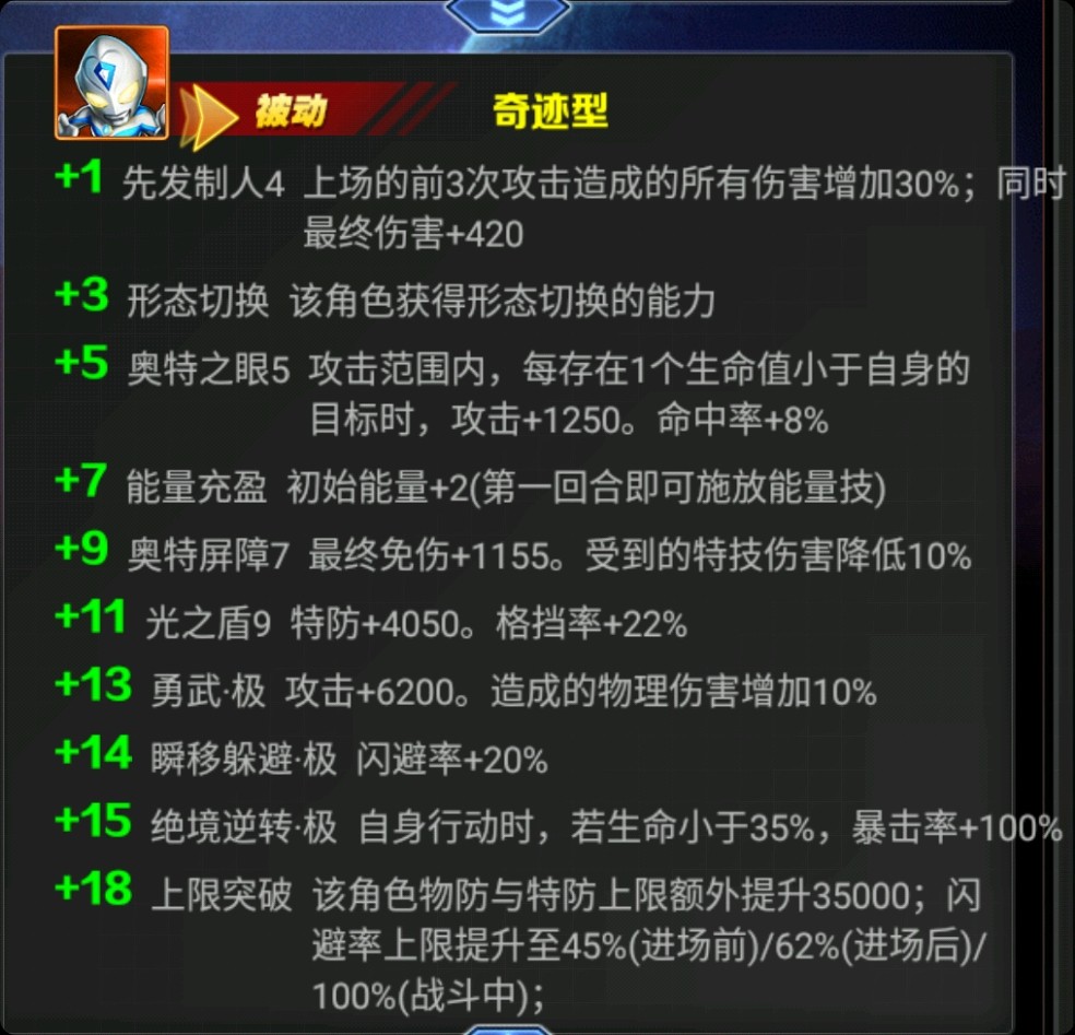 优点:大招增加的格挡率降低敌方格挡率,前期可降低敌方对自身造成伤害,同时确保自身伤害不被敌方格挡,被动先发制人不受前三回合限制,可每一次造成伤害增加30%