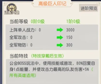 特技类主要应用的地方是活动中,如竞技场,矿战,公会BOSS,黎明之战中运用的。(这个时候也是需要灵活的切换战技,能够在以上活动中有特殊的发挥作用)巨人战技:运用于公会BOSS,有效增加伤害。