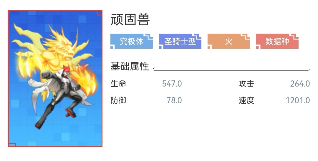 顽固兽:圣骑士型数码兽,继承「皇家骑士」的数码兽。在数码世界最西南部建造了他的居所,不过他很少逗留在同一地方,带着其接班人哈克兽在数码世界各地旅行的同时,巡回铲除变异及混沌的征兆。与其他皇家骑士很少会让人看到其存在所不同的是,他时常在当地基层活动,了解其秉性的数码兽也不在少数。为了让哈克兽继承自己作为皇家骑士的称号,给予其严酷的考验,旅途中也拜托修女兽姐妹帮助哈克兽的锻炼。因顽固的性格而对哈克兽严厉的态度,与希望他成为一个不输给其他皇家骑士独当一面的人表现出的温柔形成鲜明对比。顽固兽的身体所浮现出的「火神威」经常存在,虽不言语但不由分说地出手。「火神威」自己也有从成熟期开始的进化过程,当其力量觉醒之时,不存在在他看来想认为是敌人的数码兽。