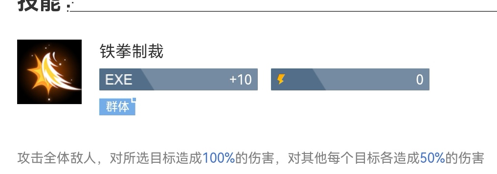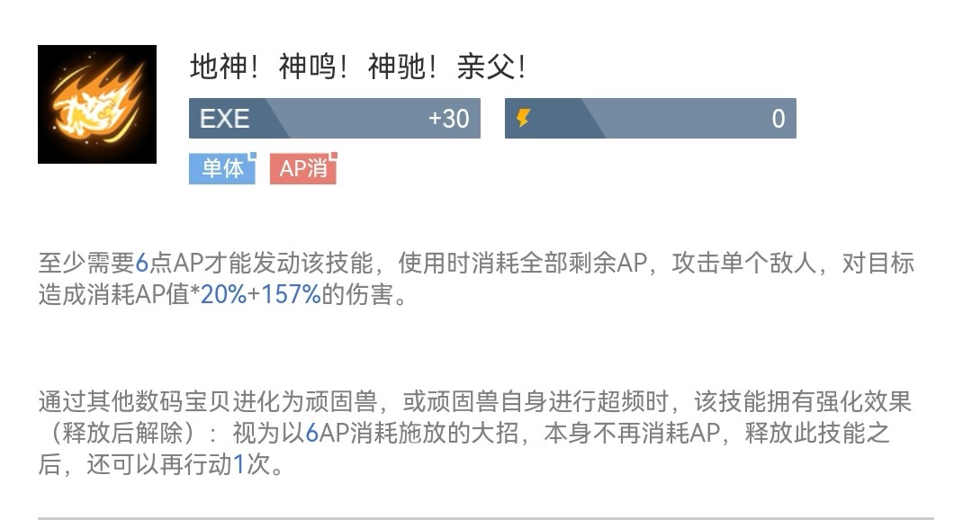 光是名字就很独特。需要六点AP才能发动使用时消耗全部AP攻击单个敌人对目标造成消耗值AP乘20%,加上157百分比的伤害。超频模式为使用一次无消耗6ap大招的伤害且可以在行动一次。消耗能量越多伤害越高,最低伤害为257%伤害,最高为357%伤害。(中规中矩)